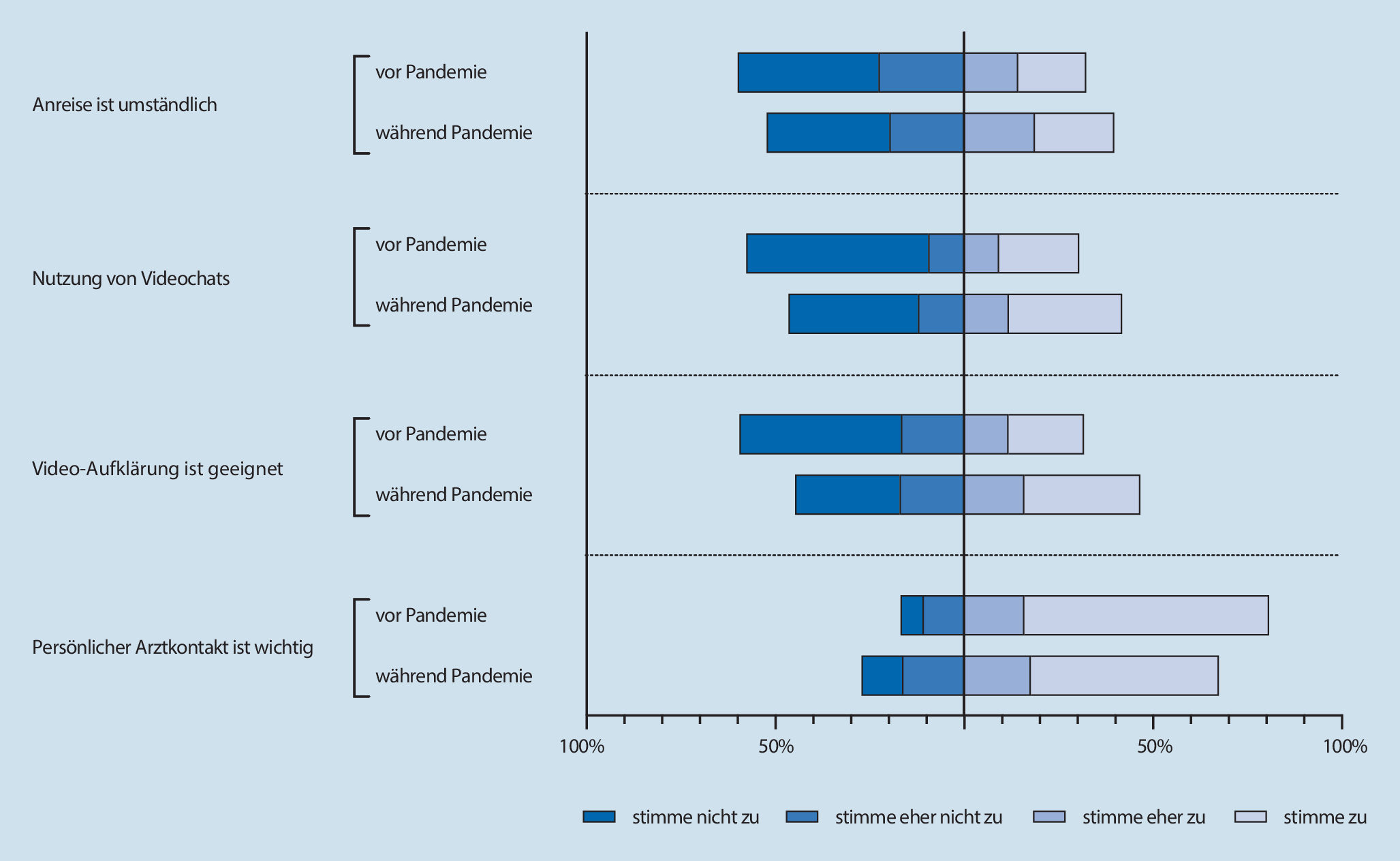 Von den vor der Pandemie Befragten bewerteten 31,7 % die Videotelefonie als geeignet und praktisch für die Vorbereitung auf die Anästhesie (20,0% stimme zu, 11,7% stimme eher zu). Während der Pandemie stieg dieser Anteil auf 46,6 % (30,7% stimme zu, 15,9% stimme eher zu).
