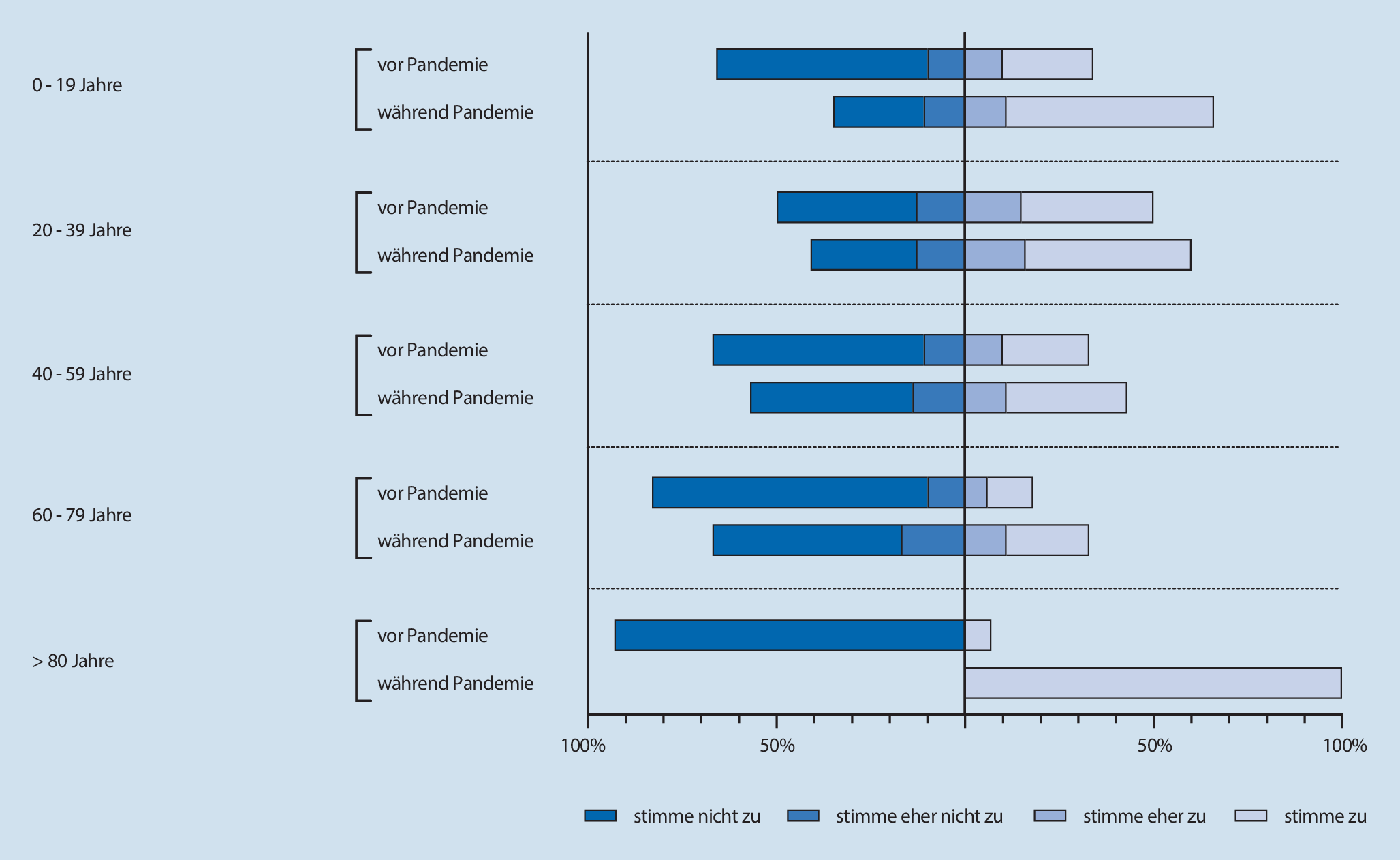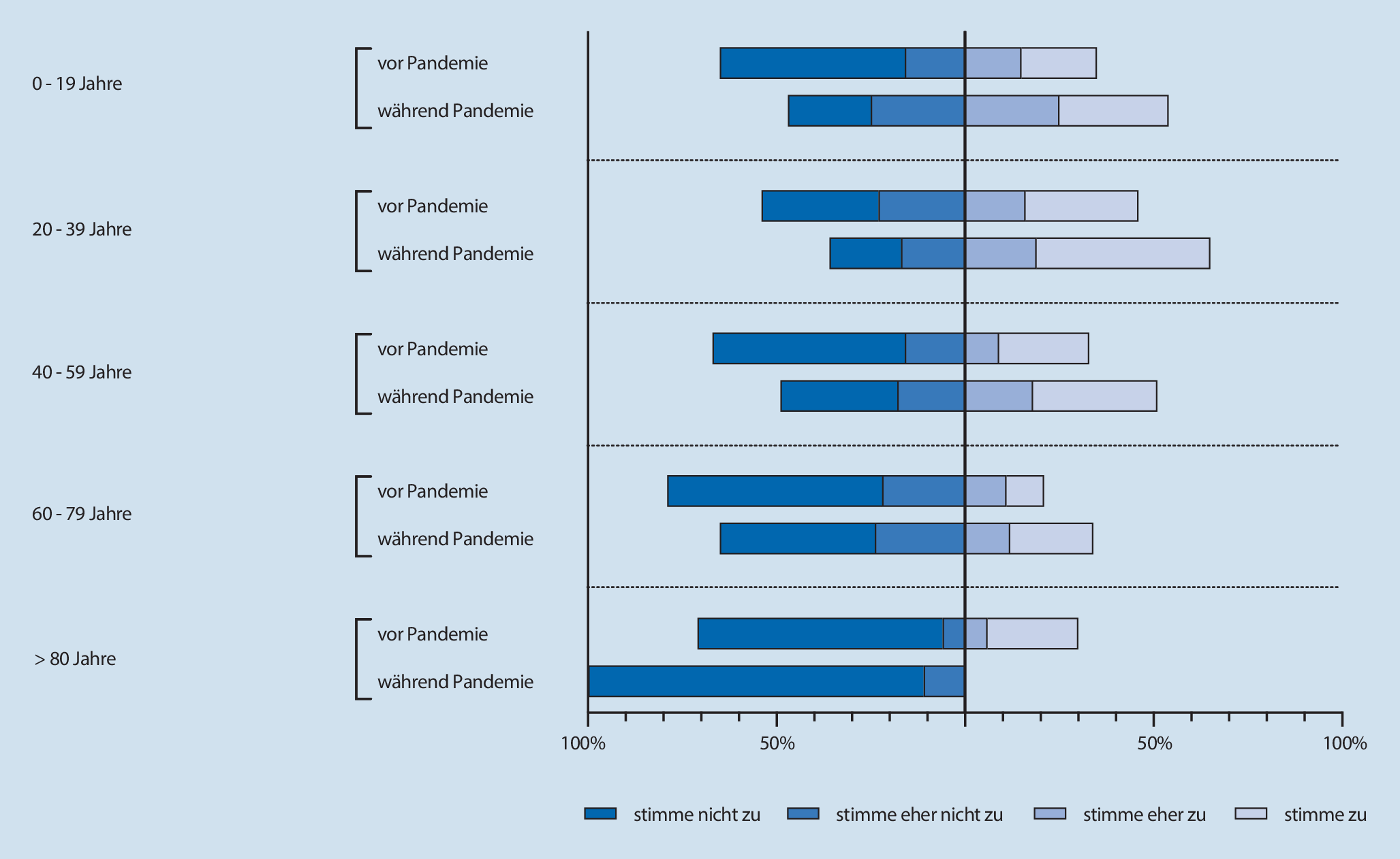 Aufgeteilt nach Alterskohorten nahmen – sofern das Alter angegeben wurde – an der Befragung 129 Personen im Alter von 0 bis 19 Jahren (61 vor und 68 während der Pandemie), 536 Personen im Alter von 20 bis 39 Jahren (245 vor und 291 während der Pandemie), 608 Personen im Alter von 40 bis 59 Jahren (299 vor und 309 während der Pandemie), 371 Personen im Alter von 60 bis 79 (199 vor und 172 während der Pandemie) sowie 30 Personen im Alter von 80 Jahren oder älter (20 vor und 10 während der Pandemie) teil. Die nachfolgenden Abbildungen zeigen die Bewertung der Aussagen „Ich nutze Videochats bereits in anderen Situationen meines Alltags“ (Abb. 3) und „Ein Videochat wäre als Narkosegespräch für mich geeignet und praktisch“ (Abb. 4) nach diesen Alterskohorten.