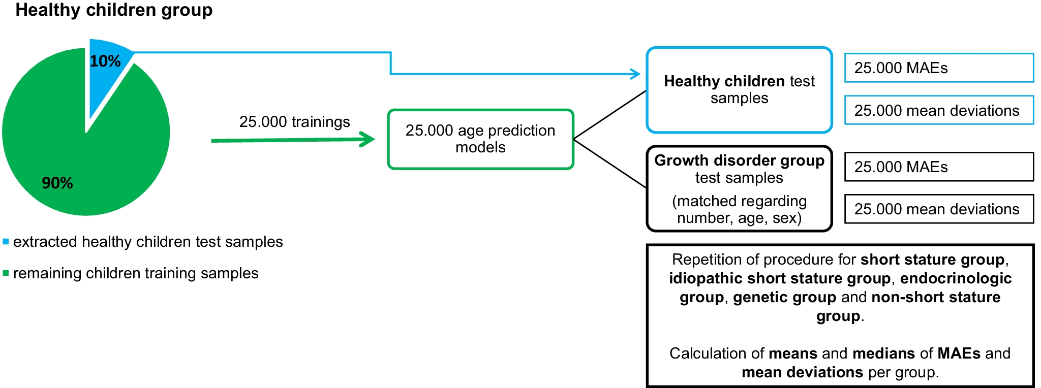 Illustration of age predictor modelling and performance procedure. Training of 25.000 models and performance testing on extracted healthy children test samples as well as on matched test samples from diseased children was performed in the same way for all growth disorder (sub-)groups. MAE mean absolute error