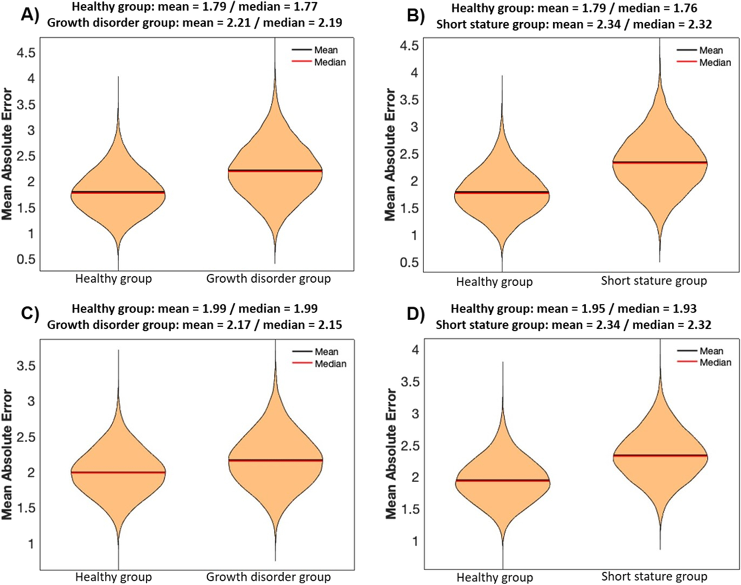 Mean absolute errors (MAE, in years) of 25,000 age estimations based on healthy children training samples (90% of the total healthy group sample number each) and performed on healthy children test samples (healthy group: extracted 10% of the total healthy group samples) as well as on test samples of the growth disorder group and the short stature group (each matched regarding sample number, age and sex). A, B 11 CpGs models. C, D 5 CpGs models