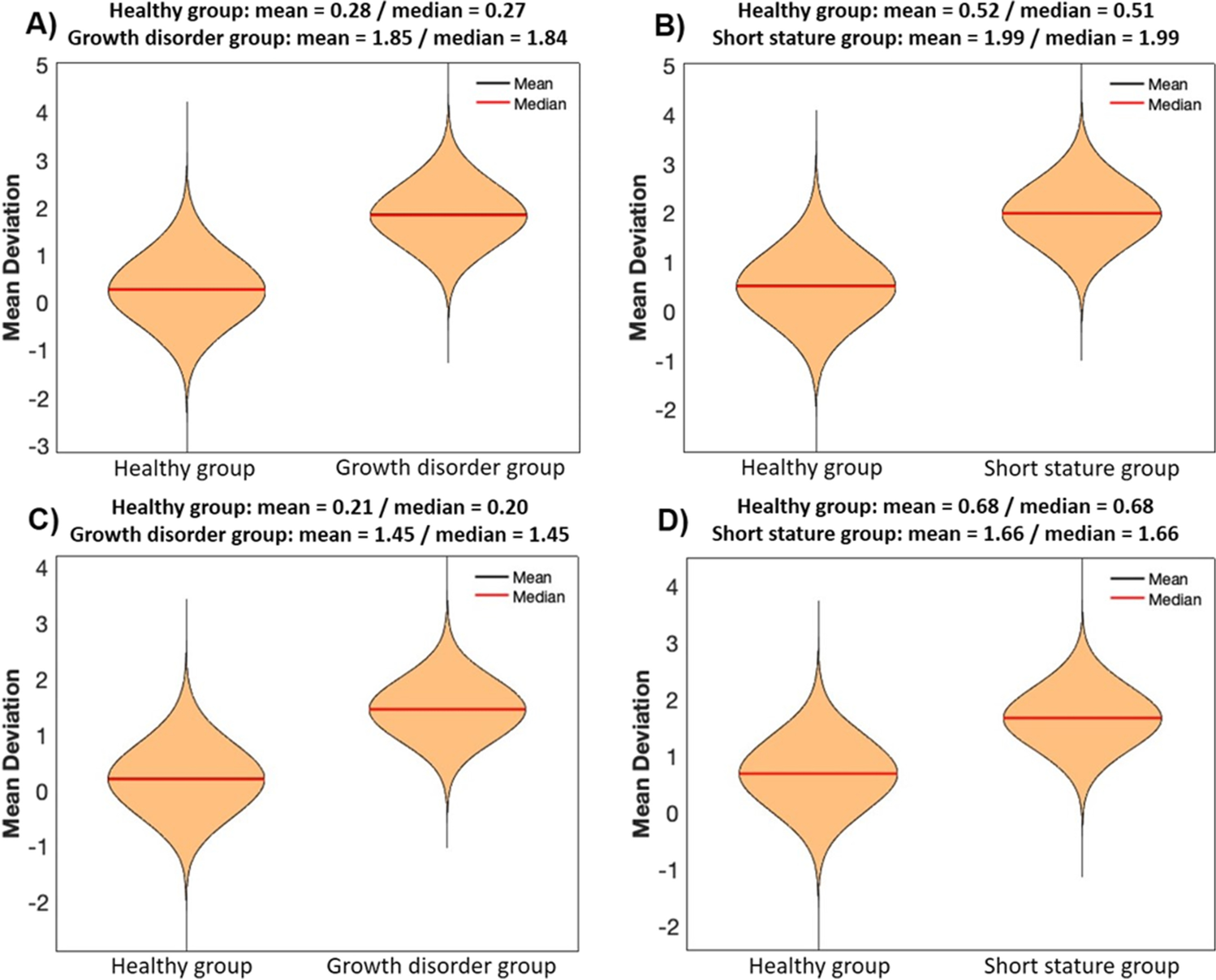 Mean deviation of the age gaps (difference between estimated and chronological ages in years) of 25,000 age estimations based on healthy children training samples (90% of the total healthy group sample number each) and performed on healthy children test samples (healthy group: extracted 10% of the total healthy group samples) as well as on test samples of the growth disorder group and the short stature group (each matched regarding sample number, age and sex). A, B 11 CpGs models. C, D 5 CpGs models