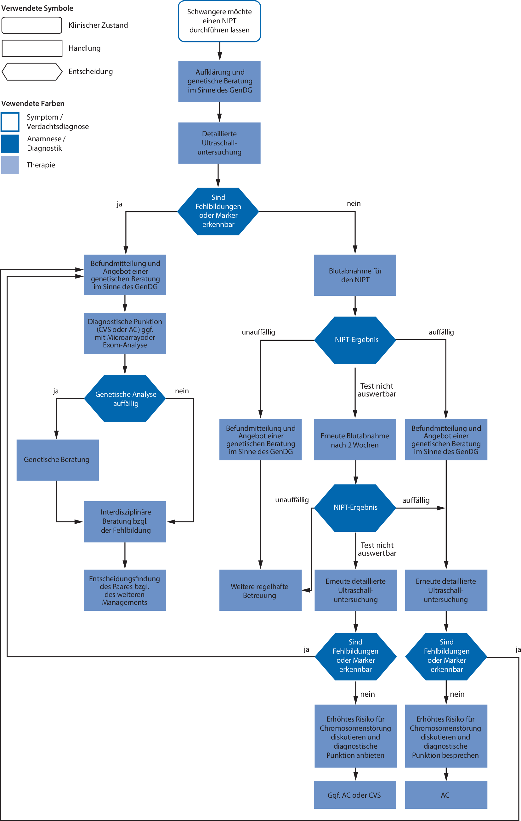 Nichtinvasiver Pränataltest (NIPT), Handlungsalgorithmus. AC Amniozentese, CVS Chorionzottenbiopsie, GenDG Gendiagnostikgesetz