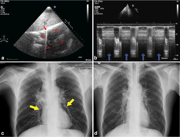 a Transthoracic echocardiogram in the subcostal view. Notice the spontaneous echoes resembling “comet tails” (red arrow) that are the result of the presence of air within the pericadial sac. RV Right ventricle, LV left ventricle, RA right atrium, LA left atrium. b M-mode shows that the artifact (blue arrows) is related to the cardiac cycle. c Chest radiography. Notice the radiolucent band around the heart siluet (“halo sign”, yellow arrows). d Control chest radiography after 1 week shows pneumopericardium resolution