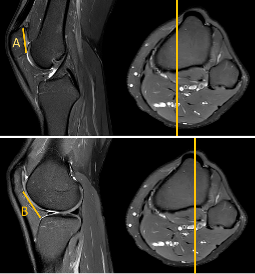 The MRI-based assessment of CD was performed using both the standard single-slice method, and the new two-slice method. The single slice assessment of CD was performed on a single sagital MR-images, utilizing the plane with the maximum length of the articular surface of the patella (Fig. 2). The two-slice method firstly measured the length of the articular surface of the patella at its maximum length (similar to Method 1), and then assessed the distance to the anterior angle of the tibial plateau in the sagittal plane going through the center of the tibial tuberosity (Fig. 3).