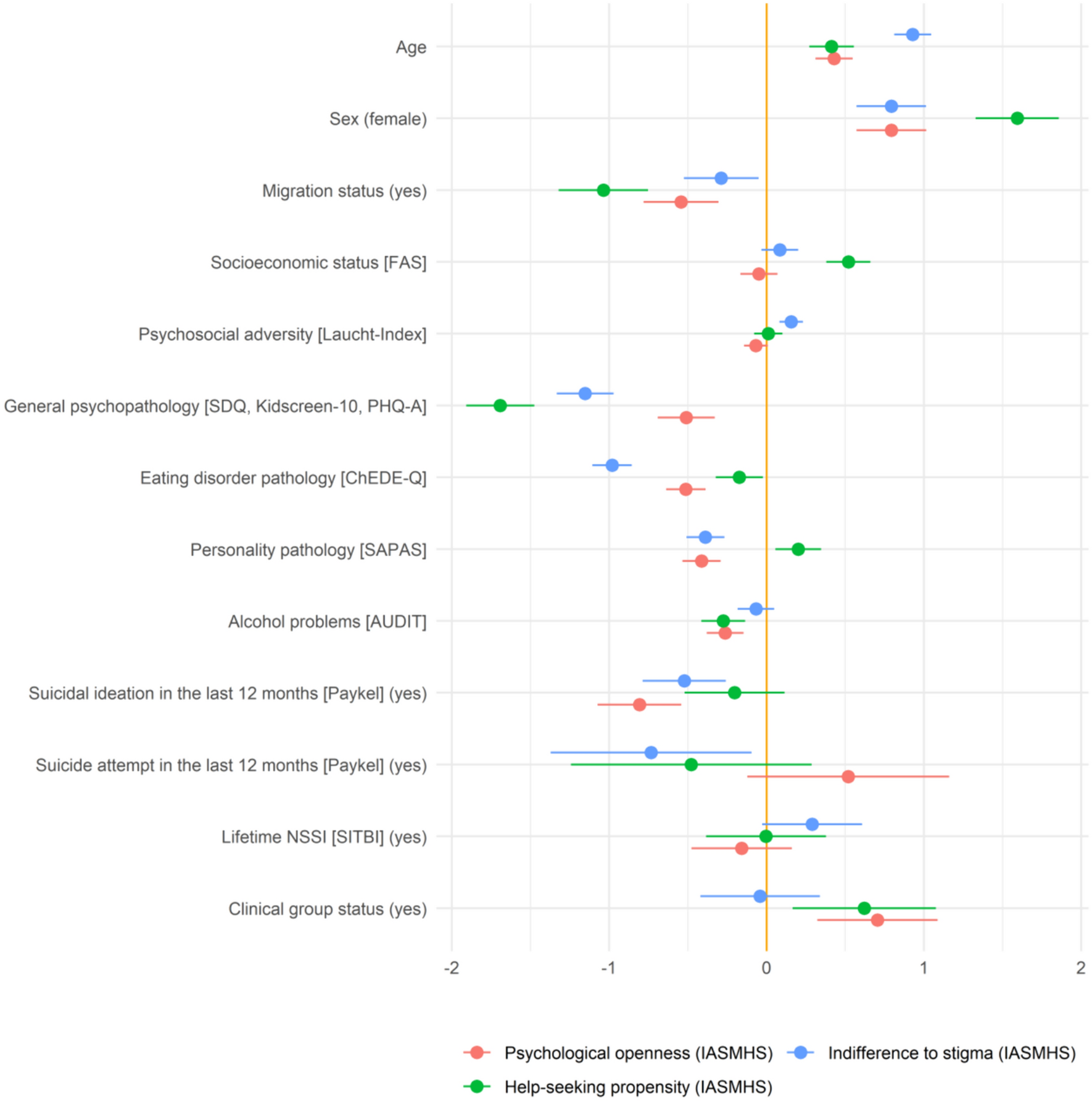36]. Interestingly, higher levels of psychopathology (i.e., general, eating disorder, and personality pathology, NSSI, and suicidal ideation) were related to more negative attitudes (as reflected in lower levels of psychological openness, help-seeking propensity, and indifference to stigma), but increased likelihood for professional help-seeking behavior. These findings raise the question whether previous negative experiences with mental health services have contributed to the negative perception about professional help, as previously reported [