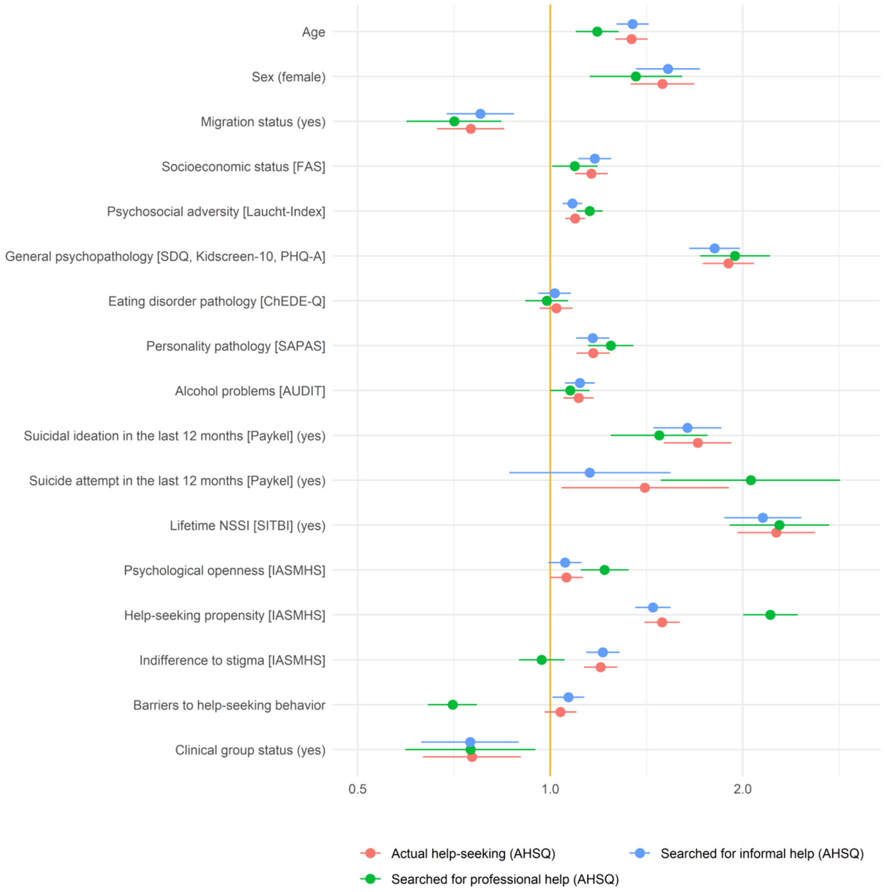 32]. Clinical factors had, overall, a greater impact compared to sociodemographic factors on both, help-seeking attitudes, and actual help-seeking behavior, potentially indicating that the level of psychopathological distress is a key determinant of help-seeking. Therefore, initiatives aimed at increasing help-seeking behavior, especially among young people with high levels of psychopathological distress, should primarily focus on fostering positive attitudes towards professional help-seeking and reducing perceived barriers. This approach is crucial for minimizing the duration of untreated illness, which is associated with poor outcomes [