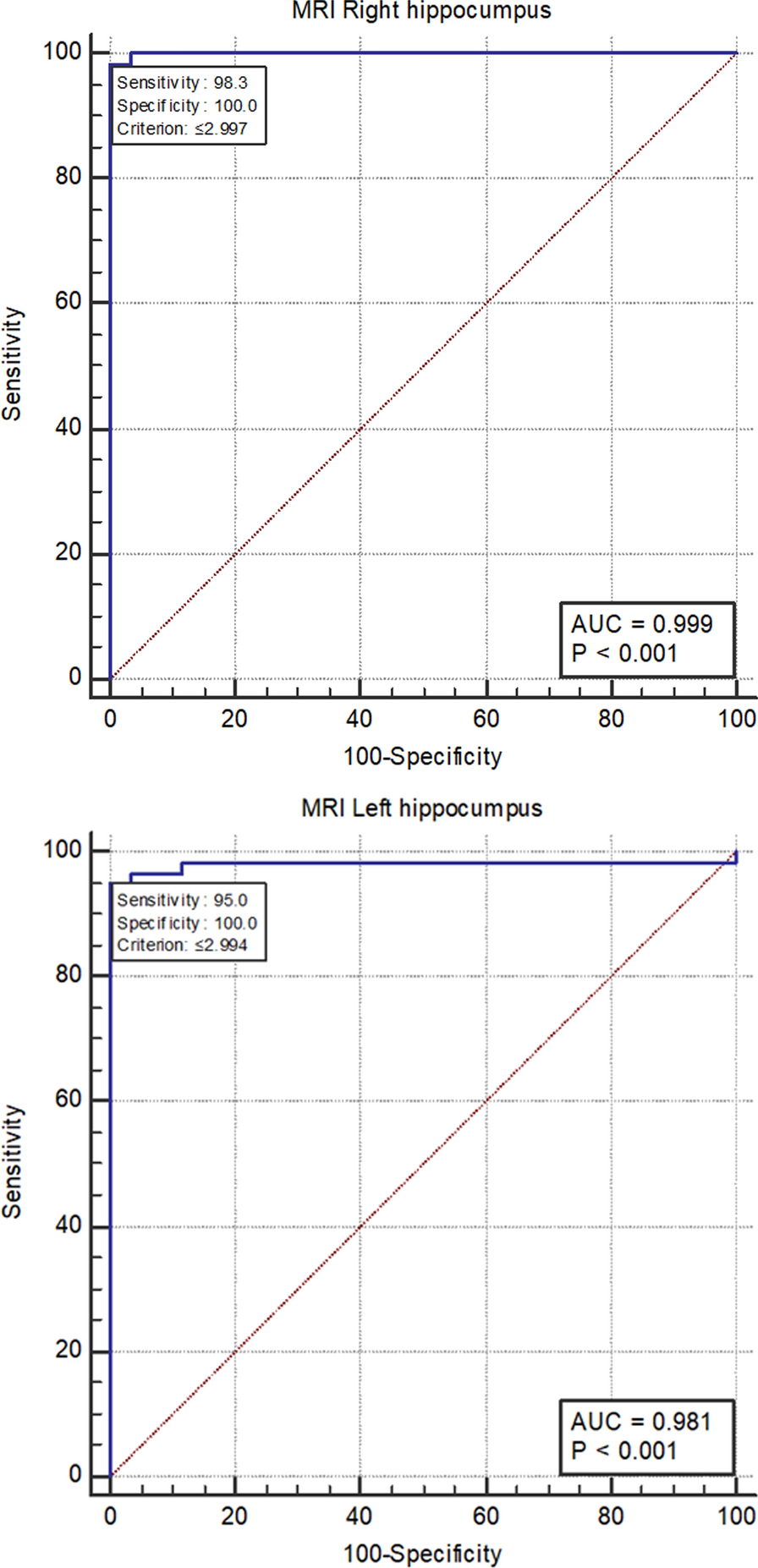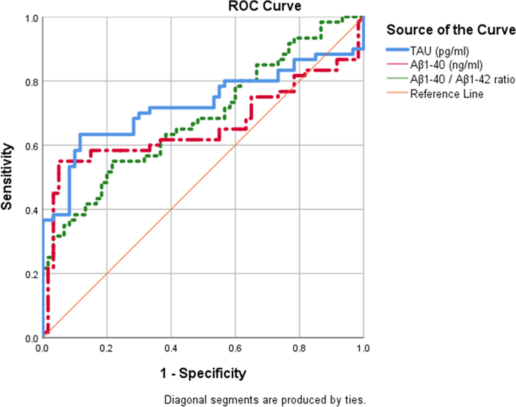Tau, Aβ1–40, and Aβ1–40/Aβ1–42 ratio are significant discriminators of AD at cutoff values of >23.45, > 84.4, and > 1.95, respectively. MRI hippocampal volume in both right and left sides are also good discriminators of AD at cutoff values of ≤ 2.997, and ≤ 2.994, respectively. A significant correlations were reported between tau with Aβ1–40, Aβ1–42, MMSE and MRI right and left hippocampal volumes. On comparing moderate versus mild AD, there was a high significant levels of tau, Aβ1–42, Aβ1–40/Aβ1–42 ratio.