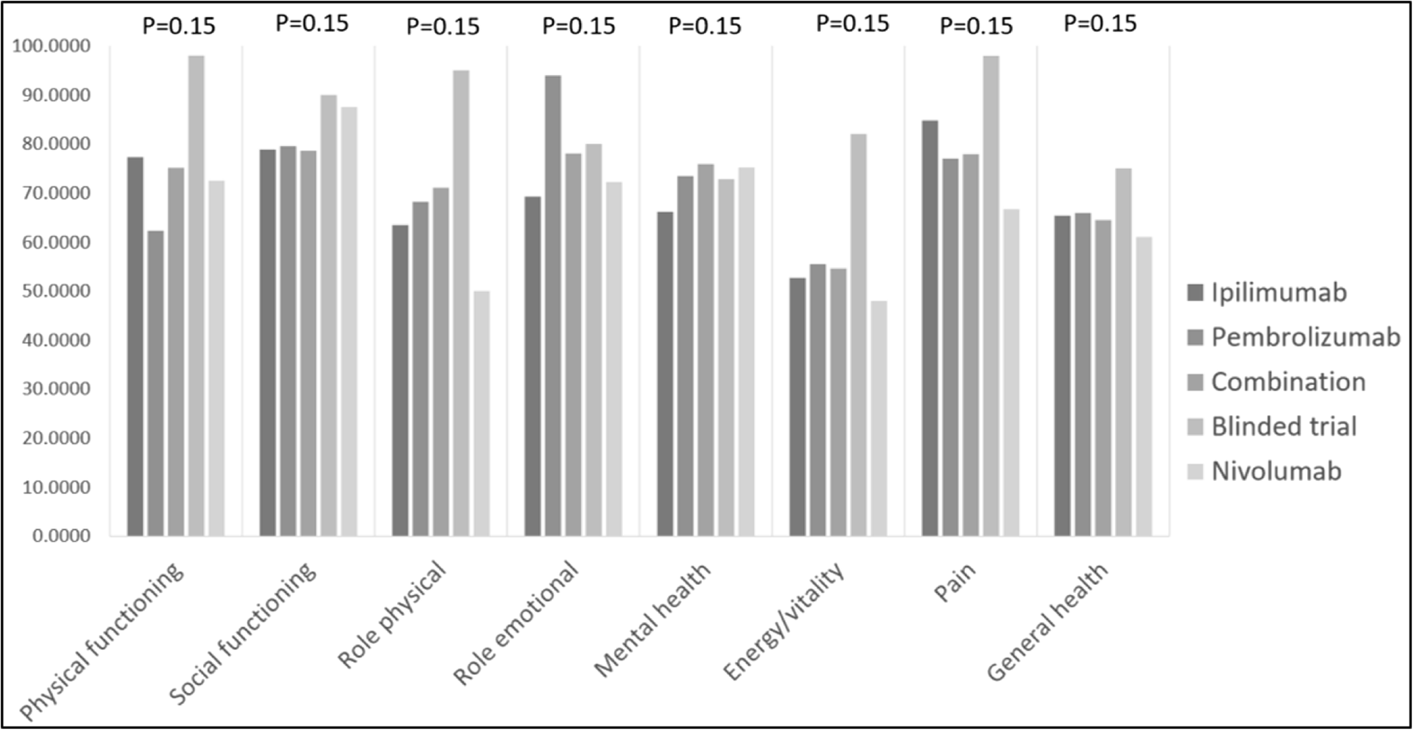 SF-36 scores subcategorised by most recent immune checkpoint inhibitor therapy