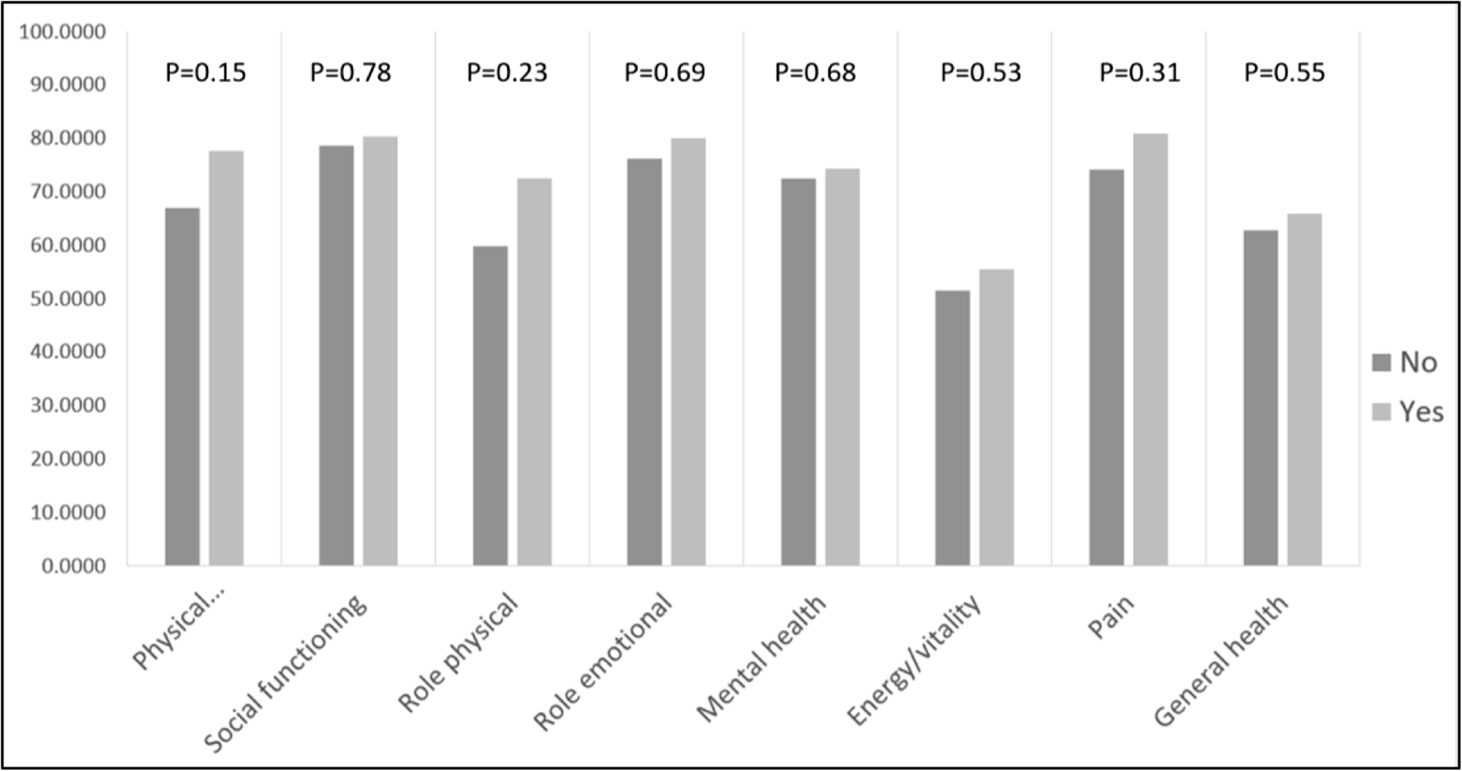 In the subgroup analysis statistically significant differences in physical functioning scores were noted when patients were categorised based on age (Supplementary data). Scores were consistently numerically inferior in elderly patients across all domains which contribute to the physical component score, physical role functioning, general health and bodily pain. These numerical differences resulted in a statistically significant difference in the physical component summary between age groups.