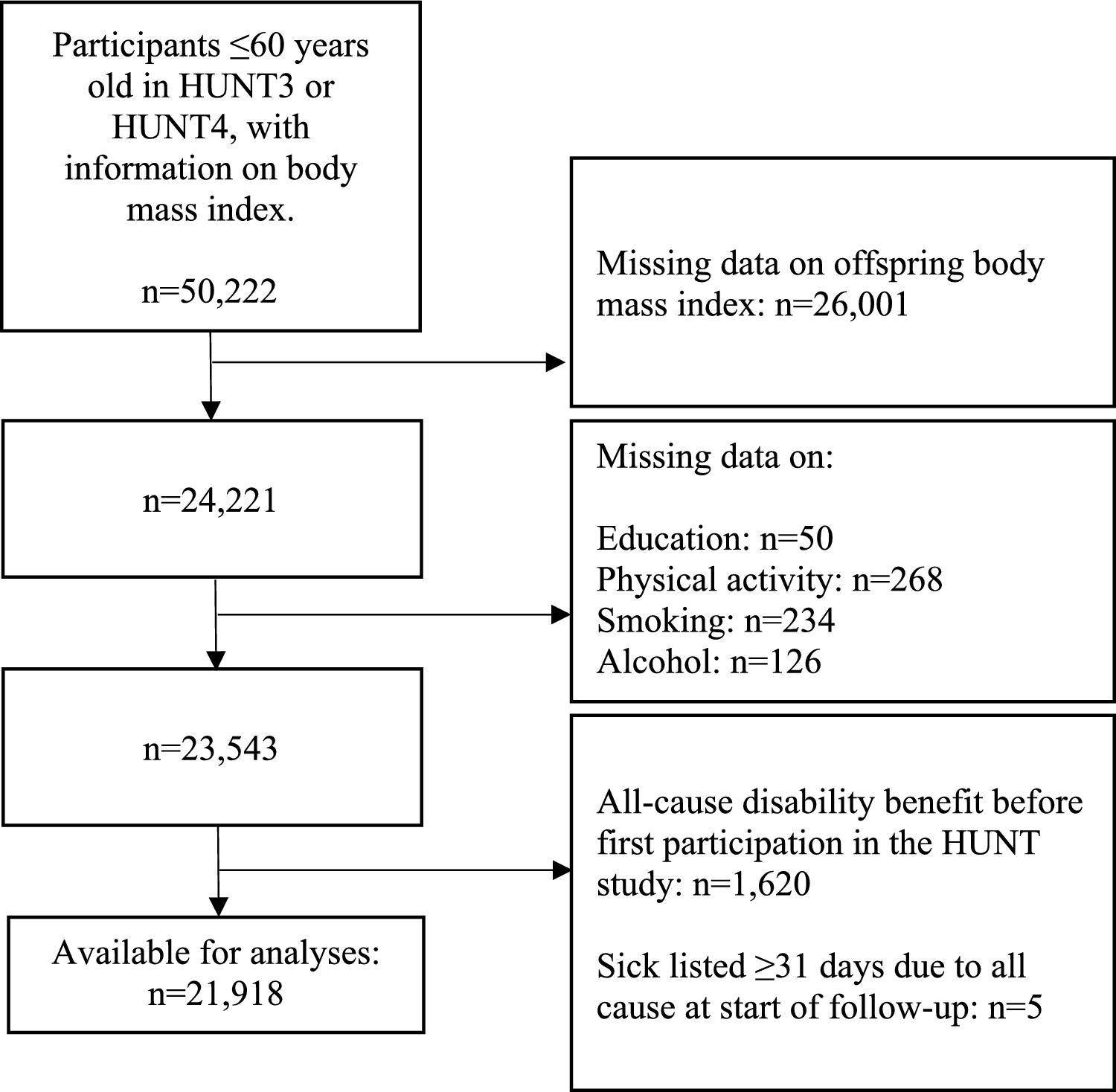 Registry data on family relations were obtained from Statistics Norway, and data from the different sources were linked using the national identity number. For those who participated in more than one survey, we used data from their first participation. Information on offspring BMI were selected from HUNT3, HUNT4, YoungHUNT3 and YoungHUNT4. If a participant had information from several offspring, the oldest offspring from the earliest participation was selected. A total of 50,222 participants ≤ 60 years with information on BMI participated in either HUNT3 or HUNT4 (Fig. 1). The upper age for inclusion was chosen to reduce competing risk events, such as early age retirement. Participants were excluded if they lacked data on offspring BMI, or their own education, smoking, alcohol consumption or physical activity. Participants were also excluded if they received disability benefits or had been sick listed for ≥ 31 days at participation. This left 21,918 participants (9606 men and 12,312 women) with complete information available for statistical analyses (Fig. 1), whereas 14,829 offspring contributed to the instrumental variable analyses.