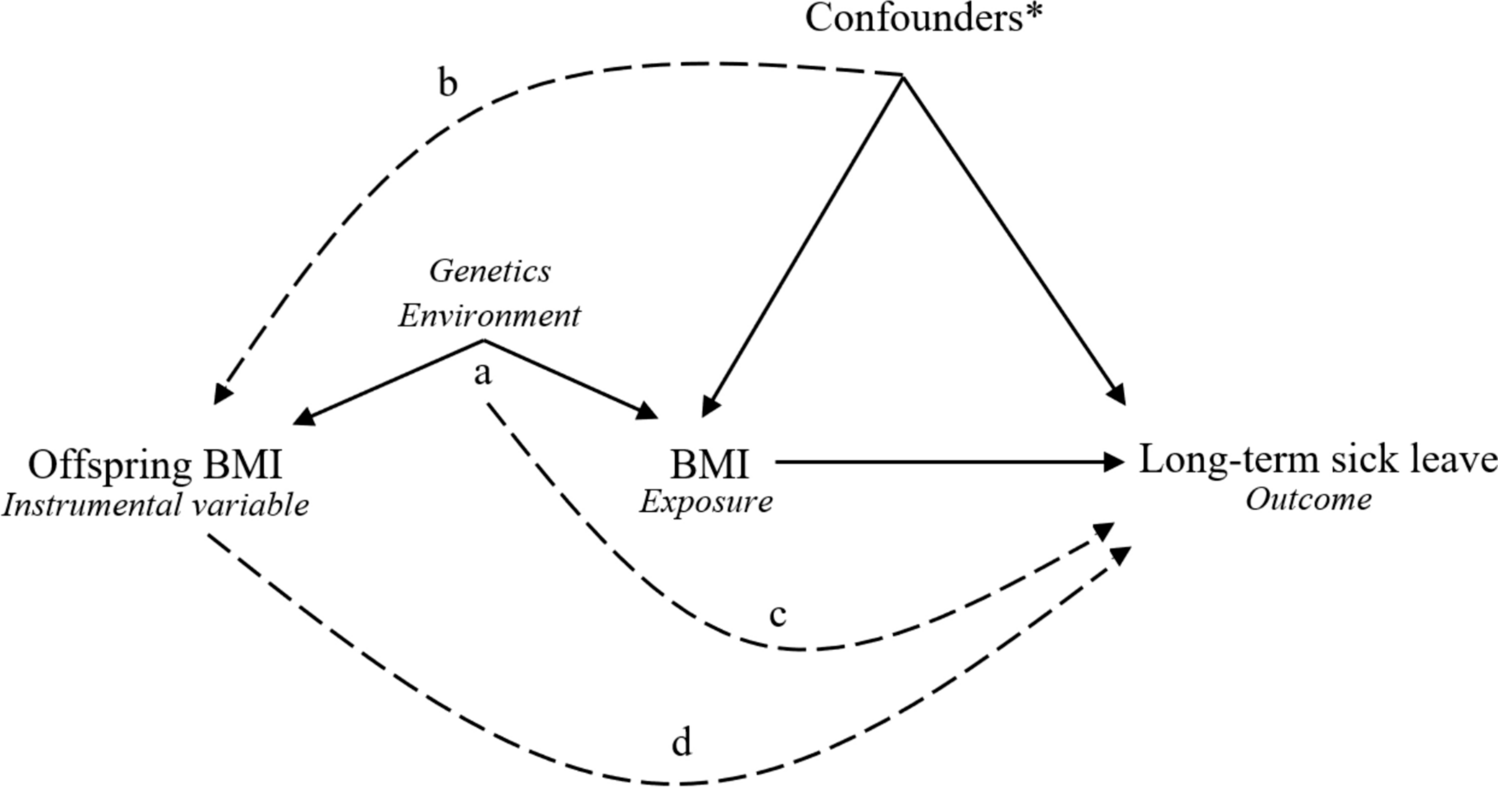 Directed acyclic graph of the possible causal effect of body mass index (BMI) on long-term sick leave. Solid lines represent causal effects, and dotted lines represent potential violations of assumptions. Instrumental variable analysis assumes that the instrument is associated with the exposure (a), that the instrument has no uncontrolled common cause with the outcome (b, c), and that there should be no causal pathway from instrument to outcome, except via the exposure (d). In the present study, however, a causal effect of offspring BMI (instrument) on parental BMI (exposure) is implausible. Therefore, we must further assume that parental BMI is not causal of offspring BMI and that the common genetic and environmental factors causing the relation between offspring BMI and parental BMI are distinct from those confounding the association between BMI (exposure) and sick leave. In other words, for a valid instrument, there may be common causes of the instrument and exposure (which are independent of the outcome) and there may be common causes of the exposure and outcome (which are independent of the instrument), but there must be no (uncontrolled) common causes of the instrument and outcome. (*) Confounders e.g., education attainment, physical activity, smoking habits, alcohol consumption, occupation