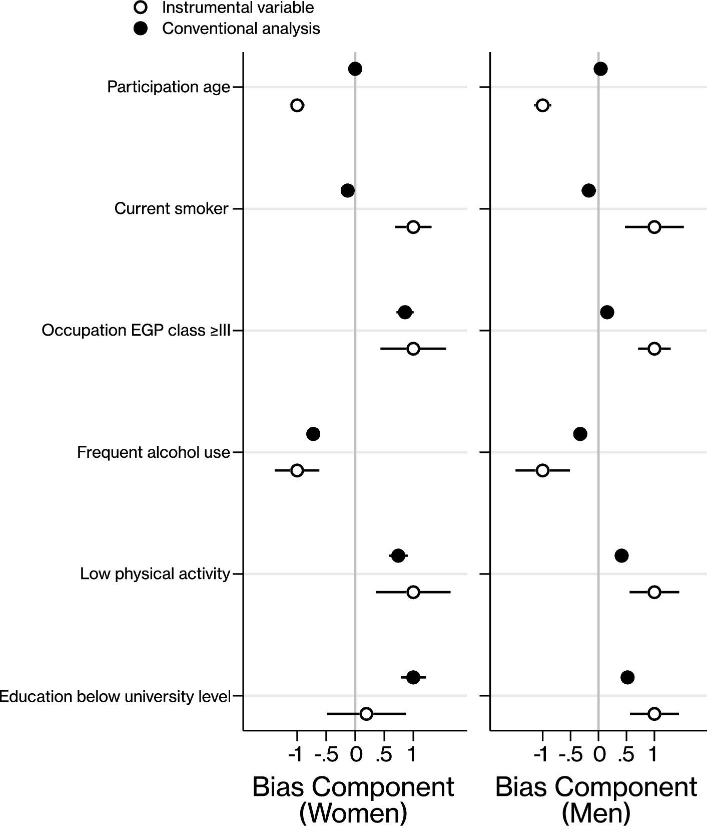We constructed a bias component plot [26, 27] comparing the relative bias between conventional estimates and instrumental variable estimates, where the plotted components are proportional to the bias which would be a result of omitting the covariate. This involved making conventional (participants’ own BMI) and instrumental variable (offspring BMI) estimates of the effect of participants’ BMI on each covariate, using logistic or linear regression as appropriate with no adjustment. The estimates from the two different methods were scaled by the absolute magnitude of the larger of each component pair. In the plot, categorical covariates were dichotomized. The plotted components are only comparable between the methods in each covariate, and not between covariates or between men and women.