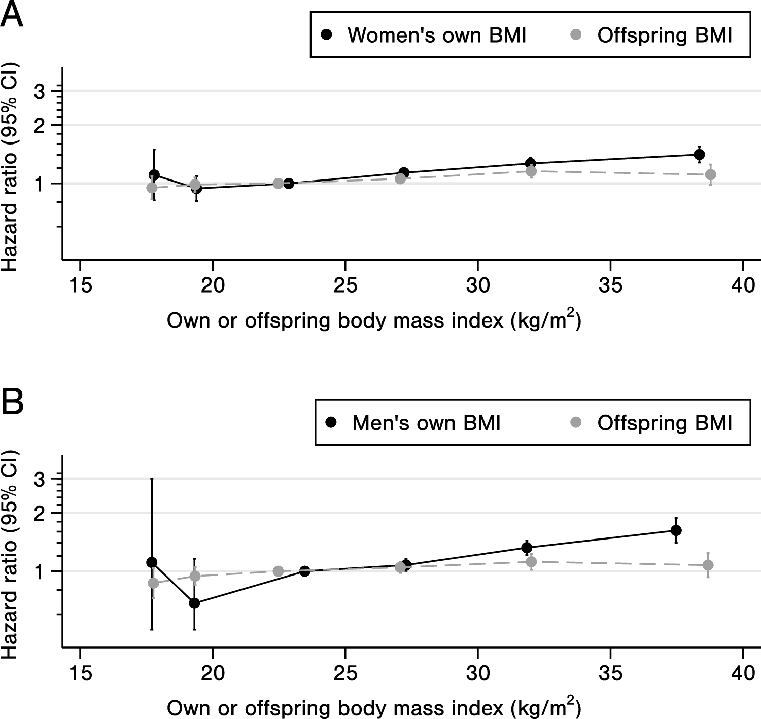 The strengths of this study include the large study population, triangulation of methods and the intergenerational, prospective design with long follow-up using nationwide registries. However, some limitations should be considered. Firstly, offspring BMI have previously been used primarily as a valid instrument for parents own BMI to overcome bias due to reverse causation by ill health. However, when used to estimate risk of sick leave, its plausible that our estimates suffer from residual confounding due to behavioral and/or socioeconomic factors. Generally, instrumental variable approaches typically depend on strong assumptions, necessitating careful interpretation of the results. It is also important to note that since this study includes family trios the results for women and men are not independent of each other, i.e., there is overlapping information on offspring BMI. Secondly, although BMI is considered a good measure for health on a population level, differences in body composition on an individual level may mislead interpretation of the estimated risk of sick leave. While weight and height (BMI) were measured by professionals, some of the adjustment variables were assessed using self-reported questionnaires, and we can therefore not rule out bias due to misclassification or measurement error. Furthermore, since instrumental variable approaches require large sample sizes, we have limited statistical power to stratify by offspring age and sex. Finally, we cannot rule out bias from the selection of participants as both parents and offspring had to participate in the surveys. However, the direction of this bias is unclear. Selection bias due to missing data on covariates is unlikely since less than 3% had missing data on covariates. Finally, we cannot rule out the possibility that BMI is linked to competing events occurring before a sick leave episode, which may lead to an underestimation of the effect of BMI on sick leave risk.