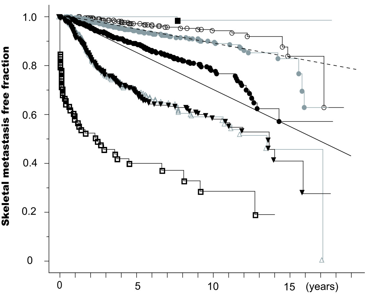Additional file 2 summarizes the results of univariate and multivariate Cox's proportional hazard analysis. The relative risk was calculated for each factor, using a hazard ratio = 1 as a baseline in each classification. In univariate Cox's analysis, age, tumor, nodal state (pN and axillary N), histology, and adjuvant therapy were characteristics that significantly correlated with an increased incidence in bone metastasis. However, menstruation status, ER, and PgR were not significantly correlated. Since both pN and axillary node are lymph node classifications, pN was taken as a representative value of nodal involvement in multivariate analysis. In the multivariate Cox's proportional hazard analysis, age, breast tumor, pN, histology and adjuvant therapy were significantly correlated factors. Multivariate Cox's proportional hazard analysis gave the following results; for pN, the hazard ratios were 2.41 in patients with pN= 1, 5.09 in patients with pN = 2, and 4.92 in patients with pN = 3, taking the value of patients with pN = 0 as 1.0. For tumor size, the hazard ratios were 0.62 in patients with non-palpable tumor, 1.63 in patients with T2 small, 2.04 in patients with T2 large, 2.74 in patients with T3, and 3.25 in patients with T4, taking the value of patients with T1 as 1.0. For histology, the hazard ratios were 2.16 in patients with scirrhous cancer, 2.74 in patients with invasive lobular carcinomas, and 1.49 in patients with solid tubular carcinoma, taking the value of the patients with papillotubular carcinoma as 1.0. Adjuvant therapy was included in multivariate analysis as an adjusting factor. This factor was worse (i.e. giving a high hazard ratio: 1.05 in hormone therapy, 2.88 in chemotherapy, and 2.07 in chemotherapy plus hormone therapy) in univariate analysis, and better (giving a low hazard ratio: 0.64 in hormone therapy, 0.8 in chemotherapy, and 0.66 in chemotherapy plus hormone therapy) in multivariate analysis. This discrepancy could be explained as follows: the high hazard ratio in univariate analysis reflected the use of adjuvant therapy for high risk patients, and the low hazard ratio arose because the patient imbalance was adjusted by other factors, revealing the true effect of adjuvant therapy on bone metastasis development, adjuvant hormone, chemotherapy or both decreasing the risk of bone metastasis.