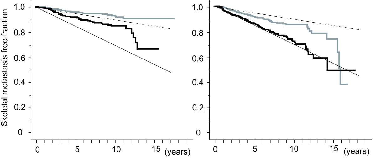 Bone Metastasis Free Fraction Curves of Stage II Breast Cancer Patients. Bone metastasis free fractions are shown for stage II breast cancer patients with medium (left) and high risk histology (right). Grey stair-like line indicates stage IIA and black stair-like line indicates stage IIB. Oblique straight lines indicate 3% per person-year (solid) and 1% per person-year (dotted) lines.