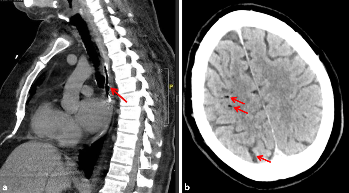 a Computertomographie des Thorax mit Lufteinschlüssen dorsal des linken Vorhofs (Pfeil), b kraniale Computertomographie: Darstellung multipler Lufteinschlüsse, rechts parietal sowie okzipital (Pfeile)