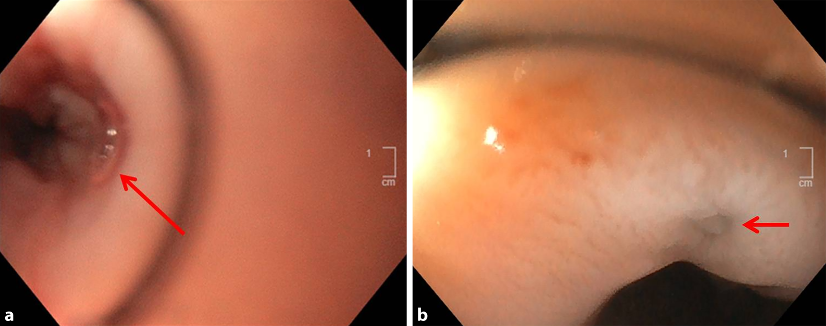Ösophagogastroduodenoskopien (ÖGD): a 2 mm große ösophageale Fistelöffnung (Pfeil) 33 cm ab Zahnreihe ohne Pusaustritt, b ÖGD-Kontrolle: Fistelverschluss, noch kleine residuelle kreisförmige Narbe (Pfeil)