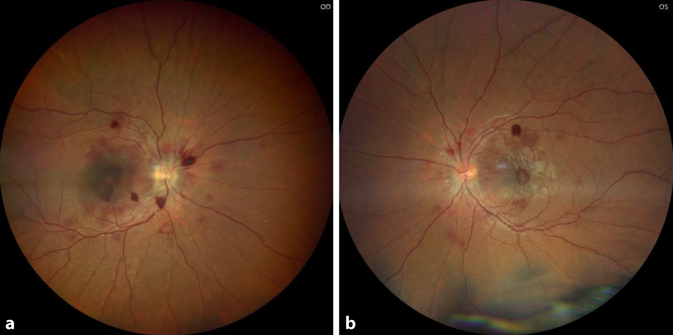 Fundusfotografiepräoperativ: Es zeigen sich rechts (OD, a) und links (OS, b) foveale und dem Gefäßverlauf folgende retinale Blutungen (Gerät: CLARUS 700 [Fa. Zeiss, Jena, Deutschland], eigene Aufnahmen)
