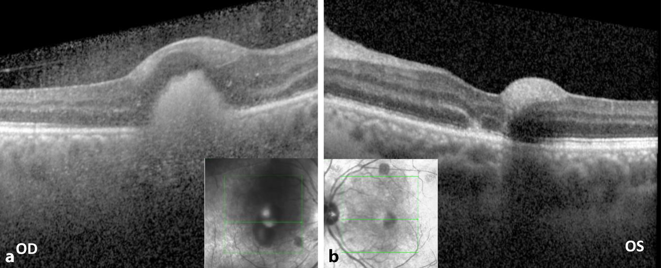 OCT präoperativ: Rechts zeigt sich eine foveale Blutung mit subretinalem Anteil (a); links eine foveale Sub-ILM-Blutung (b) (Gerät: OCT SPECTRALIS [Fa. Heidelberg Engineering, Heidelberg, Deutschland], eigene Aufnahmen)