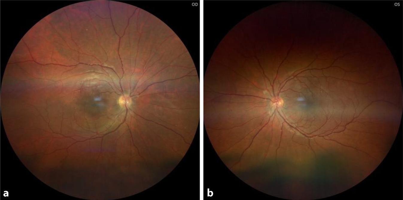 Fundusfotografie: 6 Wochen Follow-up, rechts (a) wie links (b) keine Blutungen identifizierbar (Gerät: CLARUS 700 [Fa. Zeiss, Jena, Deutschland], eigene Aufnahmen)