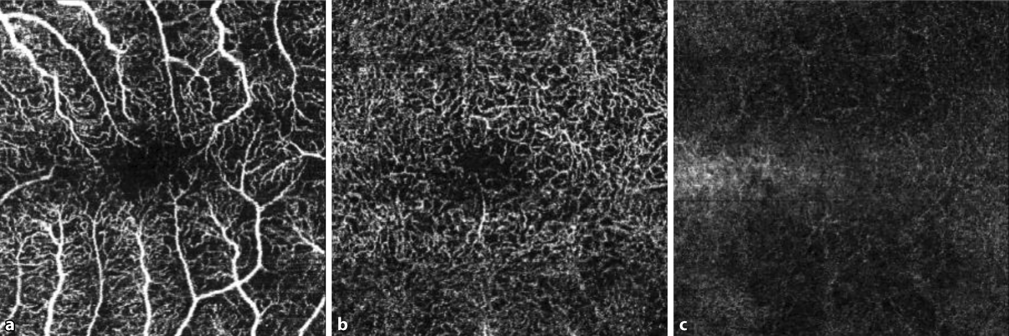 OCT-Angiographie präoperativ, linkes Auge: Darstellung der superfiziellen (a), tiefen (b) und avaskulären (c) Gefäßkomplexe (Gerät: OCT SPECTRALIS [Fa. Heidelberg Engineering, Heidelberg, Deutschland], OCT-Angiographie, eigene Aufnahmen)