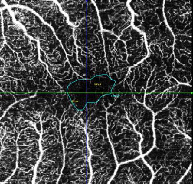 Beschreibungen zu Veränderungen der hinteren Augenabschnitte/der Retina im Rahmen von COVID-19 sind bislang rar [1]. COVID-19 kann mit einer systemischen Hyperkoagulabilität und sowohl Mikroangiopathie als auch mit lokaler Bildung von Thromben vergesellschaftet sein [2]. Auswirkungen einer SARS-CoV-Infektion auf die Retina sind daher eher sekundären Effekten der Multisystemerkrankung COVID-19 über mikrovaskuläre und thrombembolische Ereignisse zuzuschreiben [2]. Bislang konnte gezeigt werden, dass die Fovea-zentrierte oberflächliche und tiefe Gefäßdichte in der OCT-Angiographie bei mittleren und schweren COVID-Patienten signifikant reduziert ist [3, 4]. Die bei unserem Patienten präoperativ durchgeführte OCT-Angiographie zeigte links eine foveale avaskuläre Zone von 0,25 mm2, welche irregulär konfiguriert ist (Abb. 4 und 5). Die OCT-Angiographie rechts konnte bei Artefakten durch die subretinale Blutung nicht ausgewertet werden.