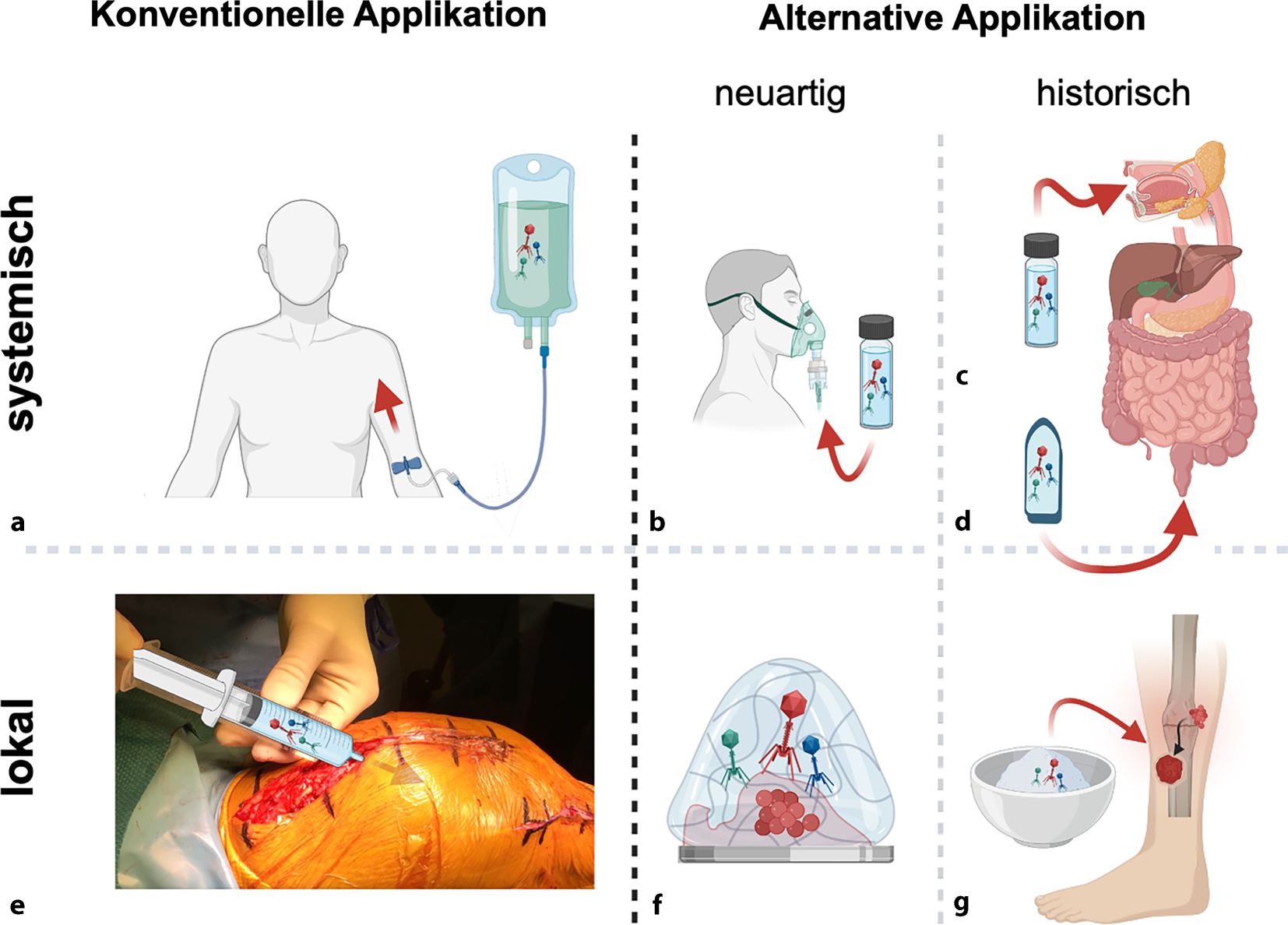 Heute gelten zwei Applikationswege als konventionell: die systemische intravenöse Gabe von pharmazeutisch hergestellten Phagen sowie die lokale Applikation intraoperativ oder durch gezielte Injektionen ([16, 17]; Abb. 2). Für die intravenöse Anwendung sind Phagen in pharmazeutischer Qualität Pflicht, um Sicherheitsrisiken zu minimieren. Weitere mögliche systemische Wege umfassen die Inhalation mittels Vernebler sowie die orale oder rektale Gabe [7, 25, 31].