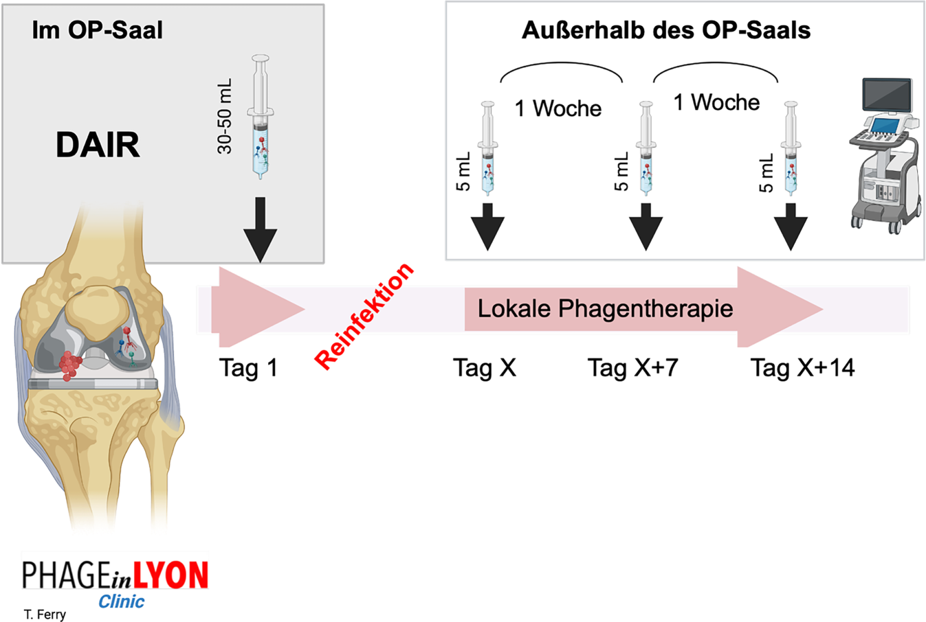 Ein innovatives Verfahren stellt das „PhagoDAIR“-Konzept dar, das in Lyon entwickelt wurde. Hier wird bei chronischen oder rezidivierenden Infektionen ein klassisches DAIR durchgeführt, wobei am Ende des Eingriffs eine intraartikuläre Einzelgabe eines Phagencocktails erfolgt. Anschließend werden während der suppressiven Antibiotikatherapie drei sonographiegesteuerte Injektionen im Wochenabstand durchgeführt ([17, 18]; Abb. 3). Diese Methode ist minimal-invasiv, katheterfrei und erlaubt die gleichzeitige Entnahme von Gelenkflüssigkeit zur Kontrolle. Sie wurde in die Studie „PhagoDAIR I“ (NCT05369104) als Rettungsmaßnahme integriert.