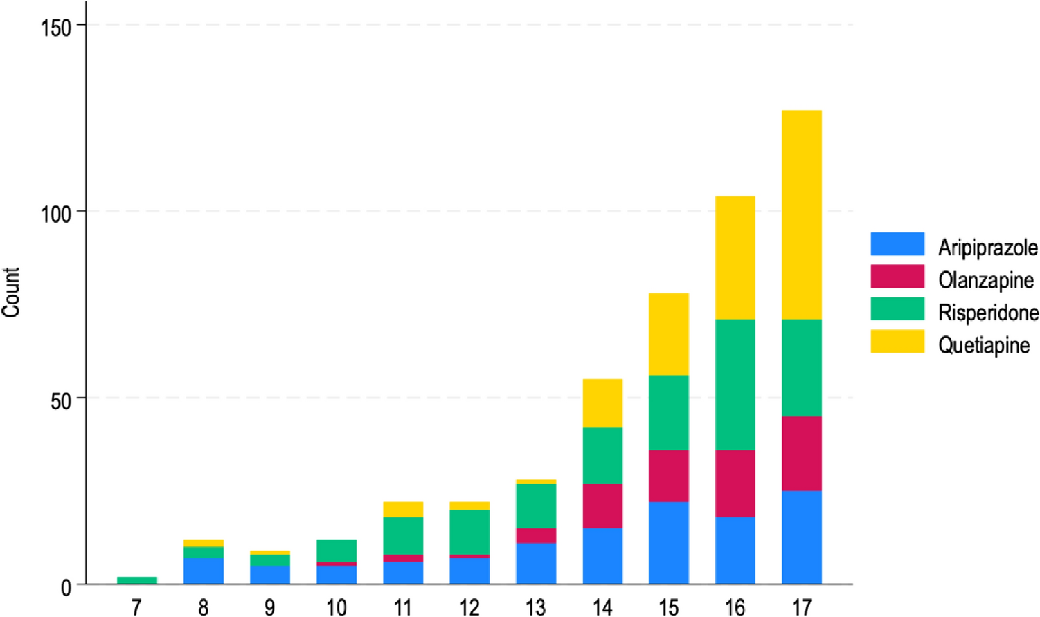 The antipsychotic most commonly prescribed to children and adolescents in our cohort was quetiapine (29%), followed closely by risperidone (28.6%) and aripiprazole (24.5%). In a study by Dinnissen and colleagues, who investigated adherence to antipsychotic prescribing guidelines among Dutch child and adolescent clinicians, the most prescribed antipsychotic was risperidone (68.3%), with aripiprazole (9.2%), olanzapine (6.7%) and quetiapine (1.6%) prescribed less frequently [