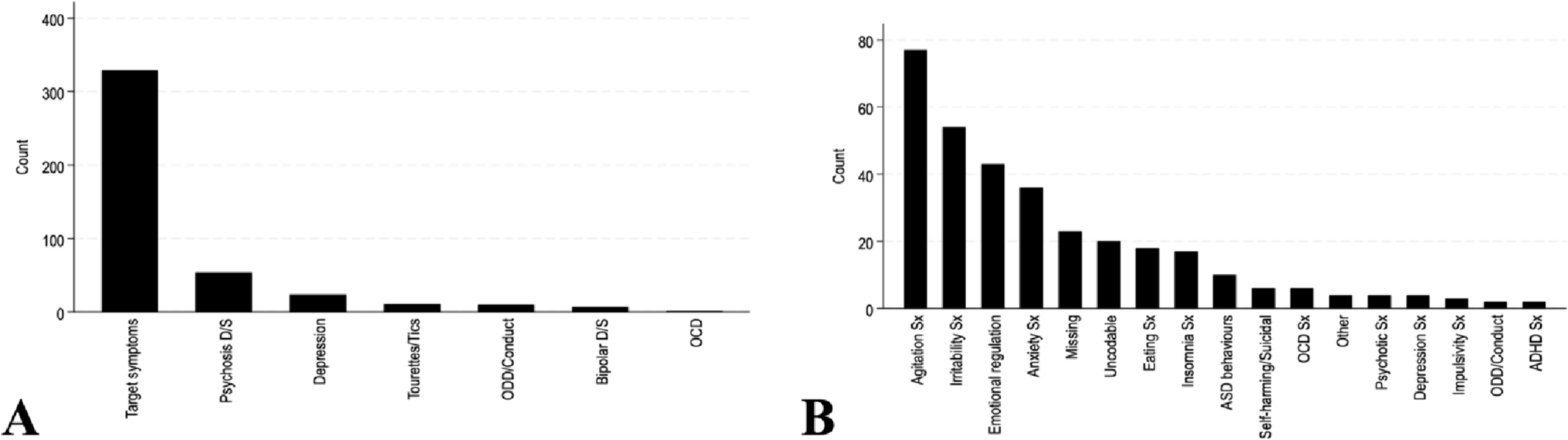 The data highlights a high amount of off-label prescribing of antipsychotic medications to young people attending specialist child and adolescent mental health services in Ireland. There is limited licensed indications for use of antipsychotics in children or adolescents in Ireland. As such, any indication based on target symptoms alone without a defined condition (e.g., conduct disorder or psychosis) is deemed off-label. There is a recognition that off-label prescribing does not imply improper or illegal use and is often necessary practice in children and adolescents in order to benefit the individual patient [
