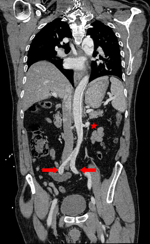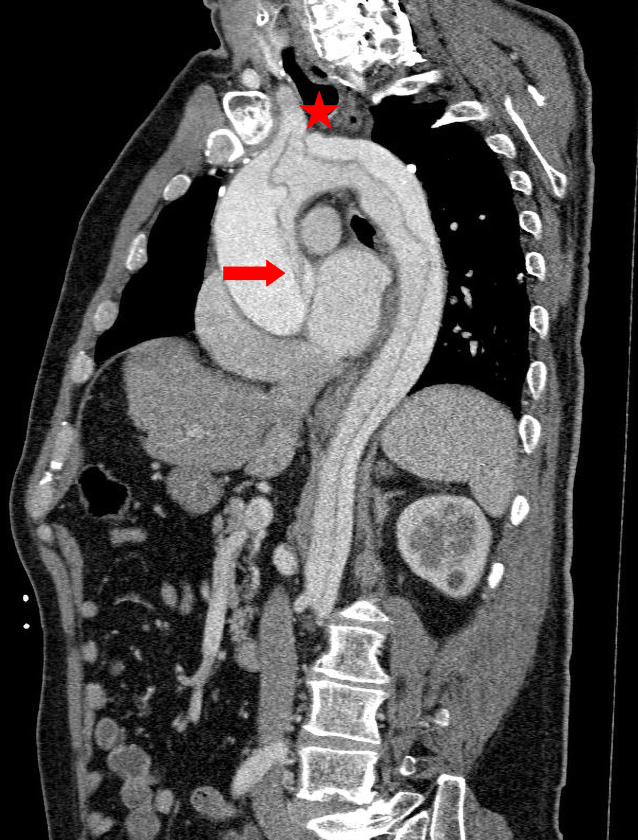 Sagittalschnitt: „Entry“ der Dissektion auf Höhe des Aortenbulbus (Pfeil), Beteiligung der Kopf-/Halsgefäße (Stern) und Verlauf bis weit in die Aorta abdominalis
