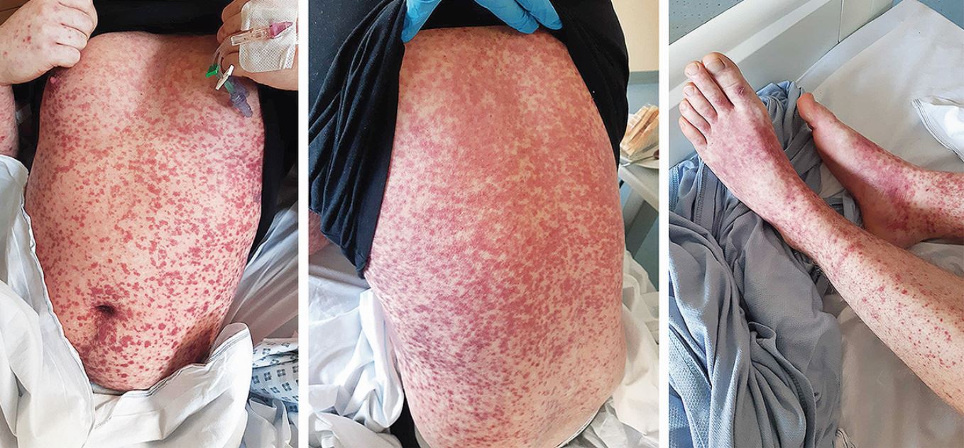 Morbilliformer, teils zu Purpura konfluierender Ausschlag am ganzen Körper.