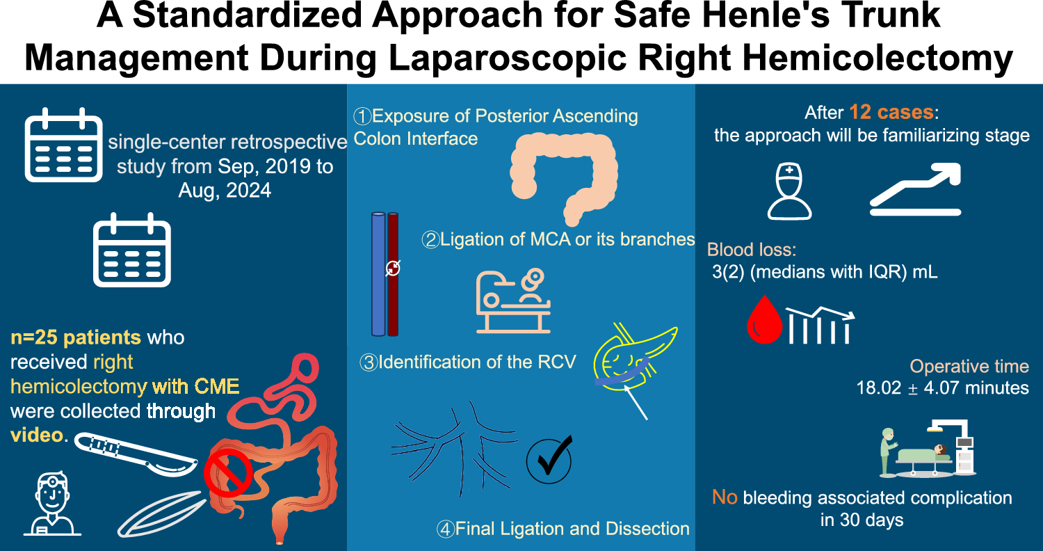 The 4-step procedure is safe and effective for management of Henle’s Trunk branches in right hemicolectomy, and the method has a short learning curve, which can be appropriately promoted.