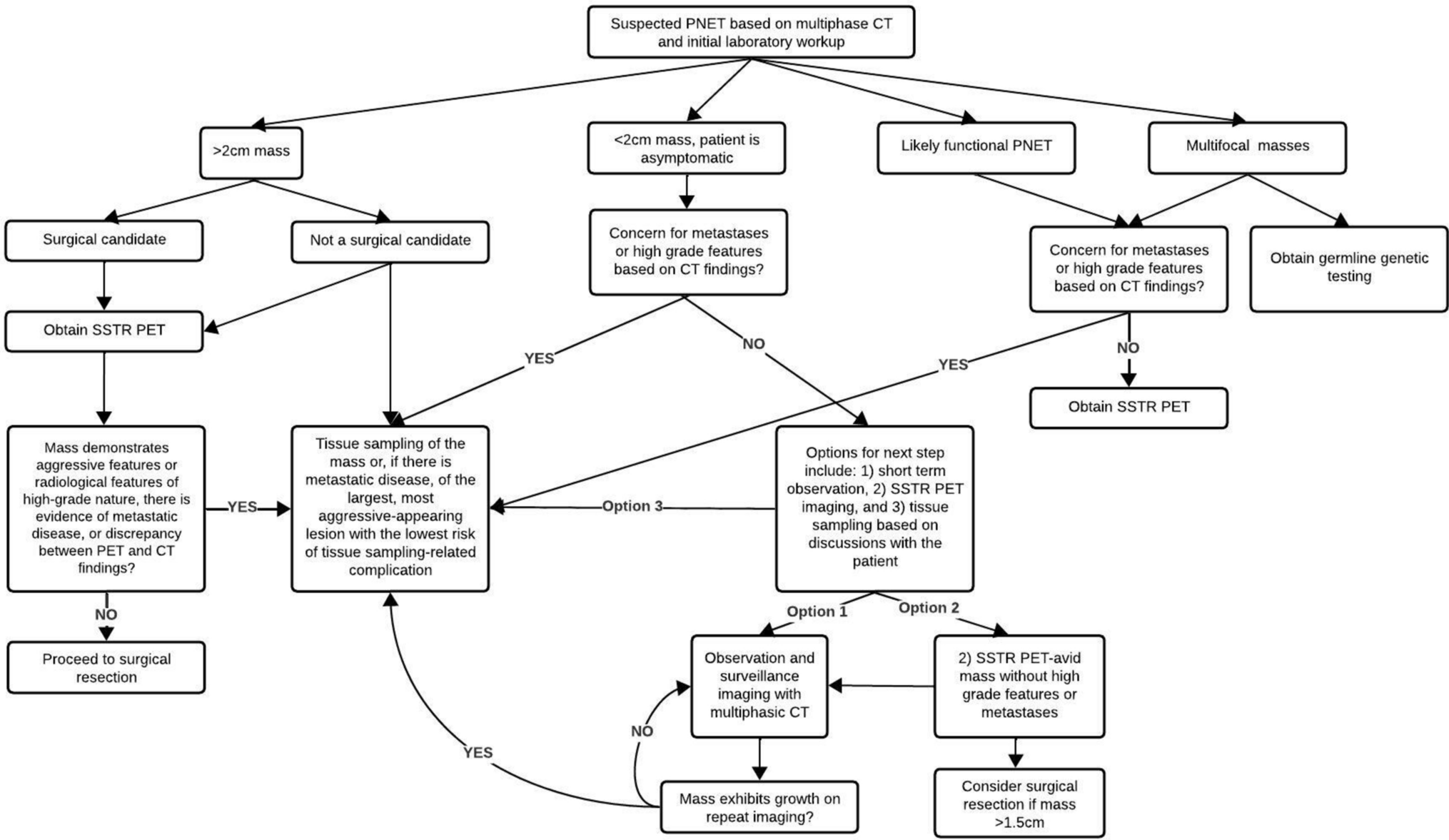 • Utilize SSTR PET imaging for workup and staging • Consider tissue sampling before surgical intervention in the presence of aggressive or high-grade radiological features |