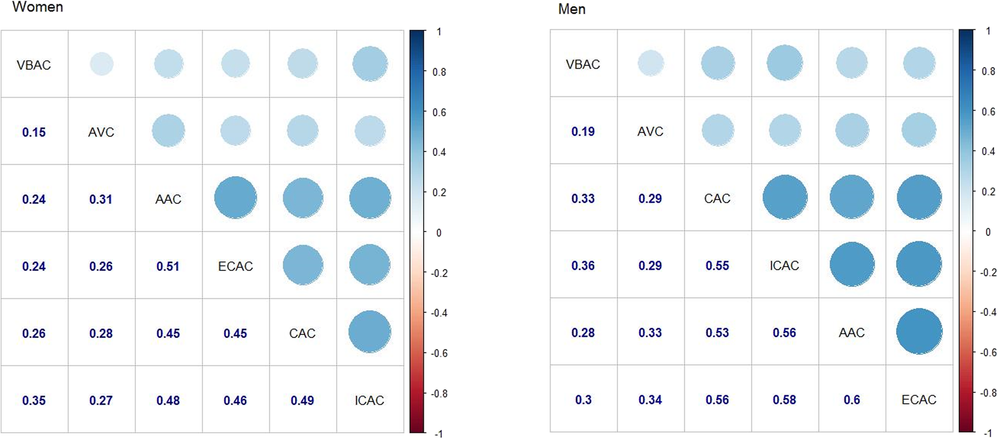 Descriptive characteristics of the study population are shown in means ± standard deviations or medians with interquartile ranges (IQR) for continuous variables and in absolute numbers and percentages for categorical variables. Differences in study population characteristics between women and men were estimated using the Mann-Whitney U test (non-parametric variables), t test (parametric variables), and chi-square test. Using Spearman’s correlation coefficient, we calculated the sex-specific correlations of calcification volumes across the six locations. We performed a non-parametric bootstrap procedure with 1000 replications to obtain interval estimates of Spearman’s rho.