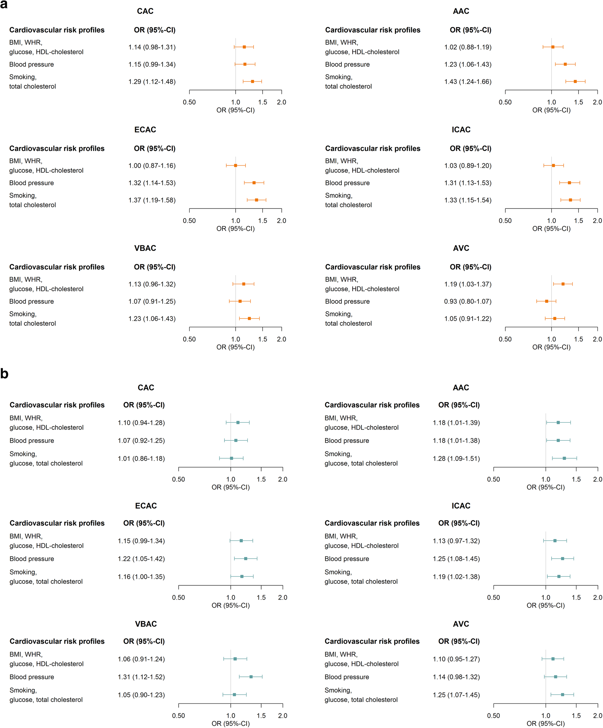 z-score scale in order to quantify its contribution to the risk factor component. Sex-specific quartiles of calcification volumes per location were computed, and the highest quartile was defined as severe calcification. For VBAC, the prevalence was only 20%, precluding the possibility of quartile analyses. Hence, for VBAC, we used the presence of calcification in the analyses. Second, using logistic regression modeling, we examined associations of the PCA-derived cardiovascular risk profiles with severe CAC, AAC, ECAC, ICAC, VBAC, and AVC, while adjusting for age, cohort, scanner, medication use (antidiabetic therapy, blood pressure- and lipid-lowering medication), and history of cardiovascular disease.
