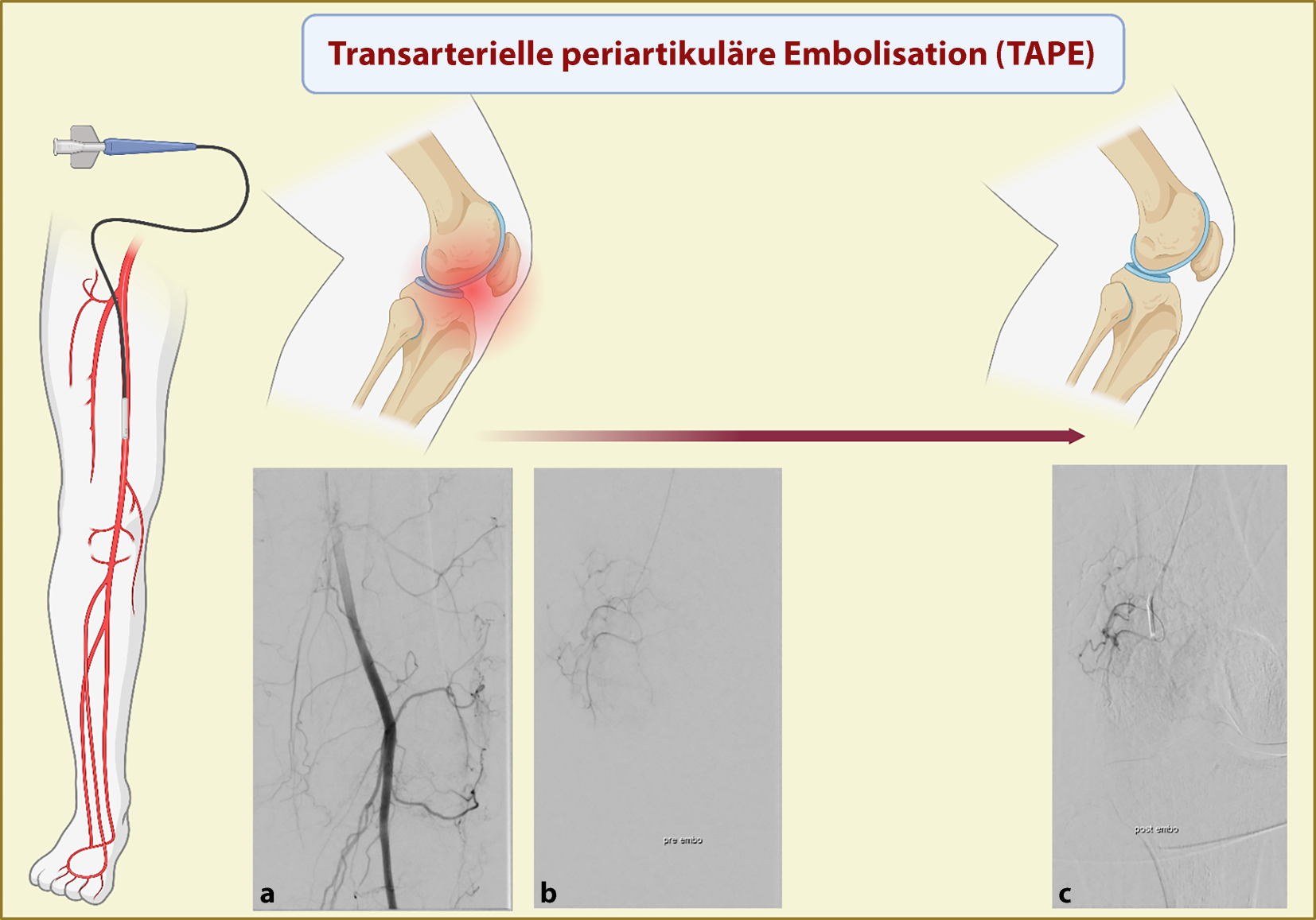Darstellung der transarteriellen periartikulären Embolisation (TAPE) des Kniegelenks bei Gonarthrose. a Angiogramm der Kniegelenkarterien, b Angiogramm prä TAPE und c Angiogramm post TAPE mit Darstellung der Reduktion der Perfusion der kleinen Kniegelenkarterien. (Agreement number: HY28FQDA7C, created in BioRender. Pfeil, A [2025] https://BioRender.com/htd02gx)