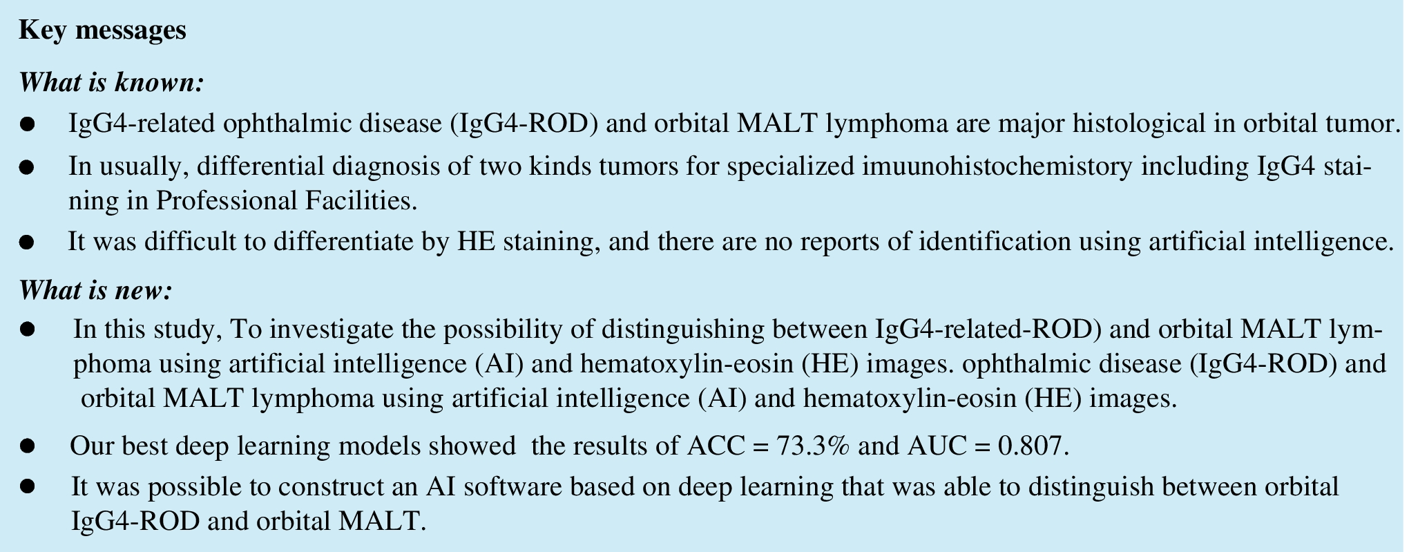 - Artificial intelligence-based differential diagnosis of orbital MALT lymphoma and IgG4 related ophthalmic disease using hematoxylin–eosin images