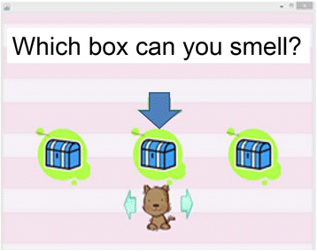 The display emitted scents from multiple holes at the same time, allowing the number of simultaneous ejections (NSE) to be set in the range of 0 to 255. Before the experiment, we confirmed that all participants understood the rules of the experiment. We began with an NSE of 80 and an ET of 200 ms based on the results of preliminary experiments and our earlier study [20]. The touch panel system displayed three boxes, each of which contained a stimulus (Fig. 3), and the olfactory detection threshold was assessed using a triple forced-choice procedure where three stimuli were presented at random (one stimulus was scented while the other two were odorless). All children were fascinated by our touch panel display. The presentation was as simple as possible so that all children, including those with ASD, could concentrate during the experiment. The subject’s task was to identify the box that contained the scented stimulus. When the participants pushed one of the three boxes, an odor was given off 3.0 s later. The participant was allowed to push each box up to two times. After two successful trials, the EQ fell by 50 %. This was continued until the participant made a mistake and selected the box that contained an odorless stimulus or until the participant cleared an NSE of 10. We administered the odors from strongest to weakest to maintain the motivation and concentration of all children. The detection threshold was generated after the procedure was completed. Measurements were finished approximately 5 min after the start of the procedure and were influenced very little by lingering scent trails. The olfactory detection threshold was defined using a logarithmic function as the NSE of the last trial. The mathematical process used to determine the olfactory detection threshold is as follows: