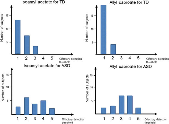 Forty-three participants took part in this study: 23 (6 females, 17 males) children with ASD and 20 with TD (6 females, 14 males). Olfactory detection thresholds of children with ASD were significantly higher than those of TD children with both isoamyl acetate (2.85 ± 0.28 vs 1.57 ± 0.15; p < 0.001) and allyl caproate ( 3.30 ± 0.23 vs 1.17 ± 0.08; p < 0.001).