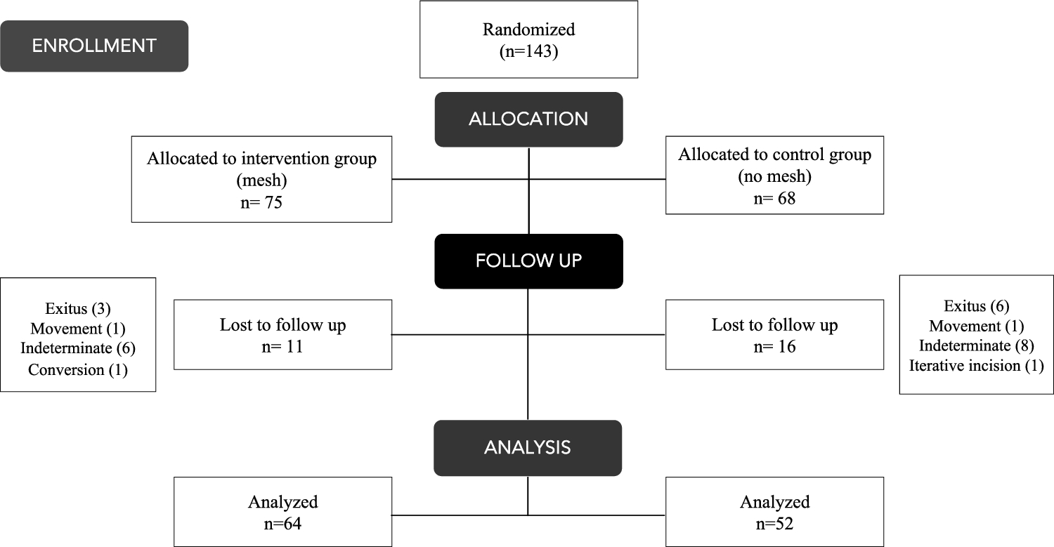 A total of 143 patients were randomized, 75 to the intervention group (mesh group) and 68 to the control group (no mesh group) Twenty-seven patients (18.9%) were lost to follow up. Finally, 116 patients were analyzed (64 in the intervention arm and 52 in the control arm) (Fig. 1).