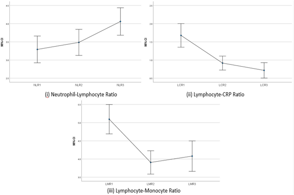 Impact of breast cancer therapy on NLR, LCR and LMR (1 = diagnosis, 2 = pre-operative, 3 = post-operative) ((i) NLR demonstrated consistent increase throughout treatment; (ii) LCR was downregulated over the course of treatment; (iii) LMR decreased during neoadjuvant therapy, with an increase post-surgery)
