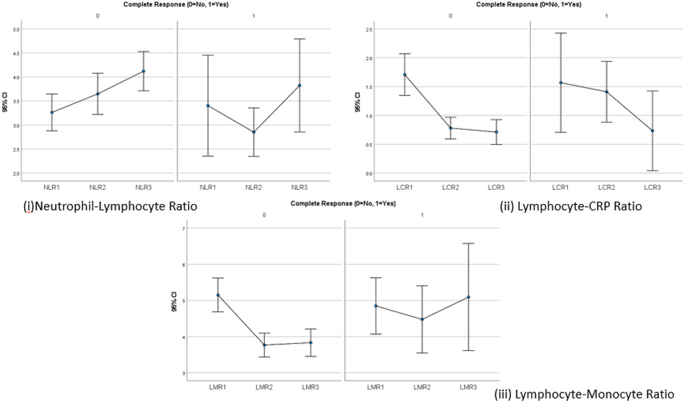 NLR, LCR and LMR in complete responders vs. non-complete responders in breast cancer (1 = diagnosis, 2 = pre-operative, 3 = post-operative) ((i) NLR at pre-operative significantly lower in complete responders (p = 0.027); (ii) average LCR values routinely higher in complete responders; (iii) average LMR lower at diagnosis in complete responders but greater in the pre- and post-operative periods)