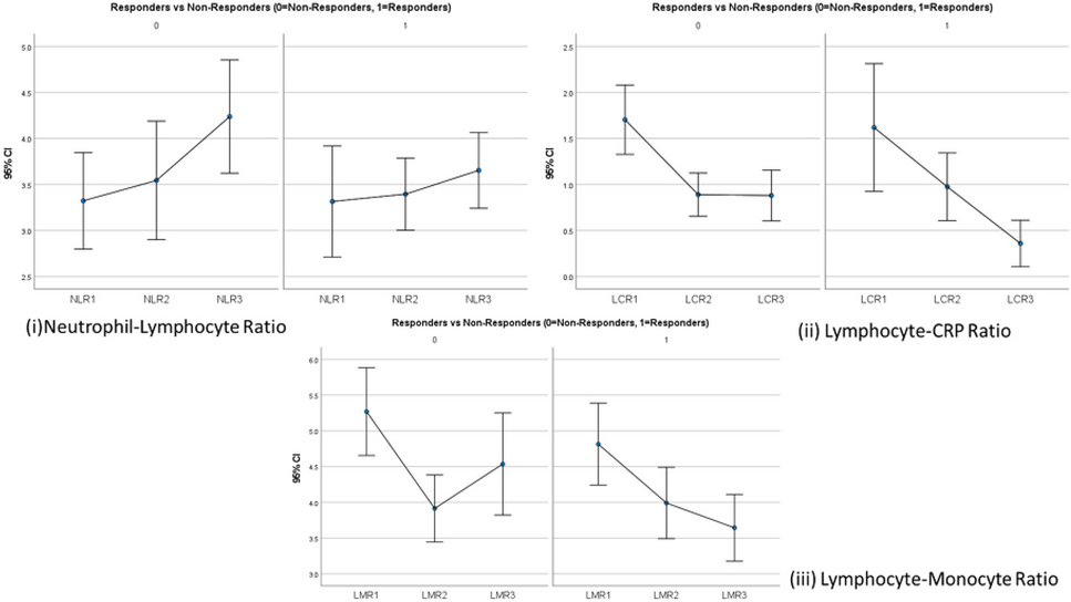 NLR, LCR and LMR in responders vs. non-responders in breast cancer (1 = diagnosis, 2 = pre-operative, 3 = post-operative) ((i) average NLR lower in responders; (ii) average LCR elevated at diagnosis in responders; (iii) average LMR lower at diagnosis and post-operatively in responders)