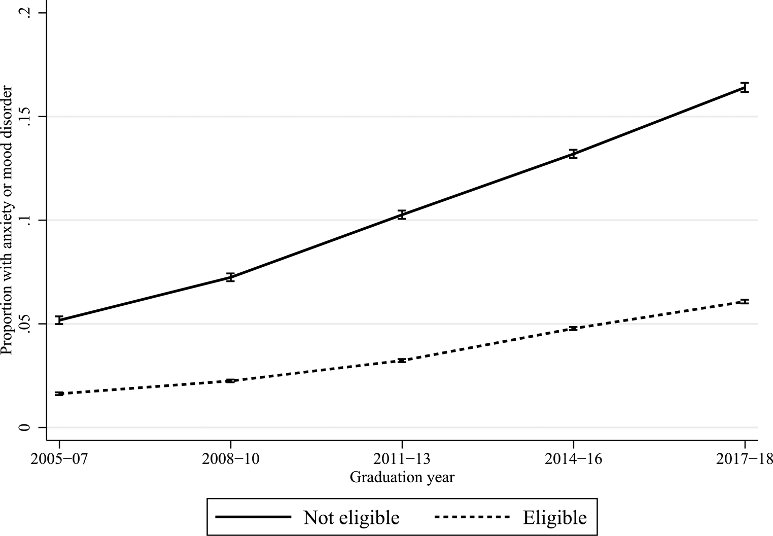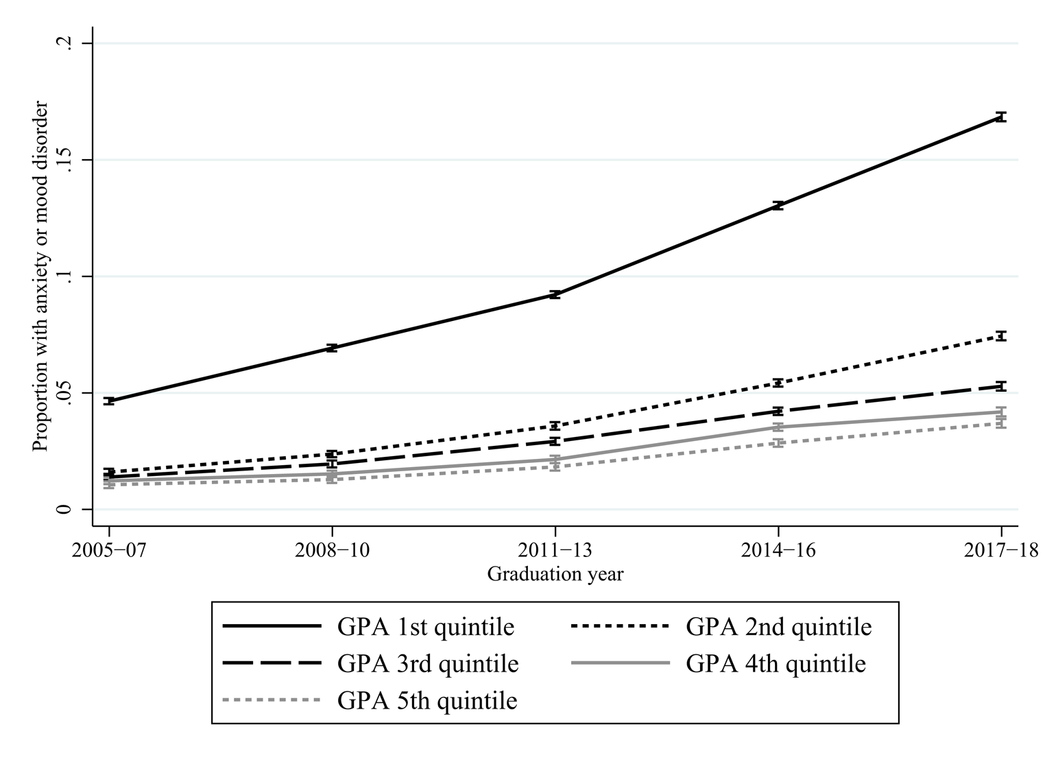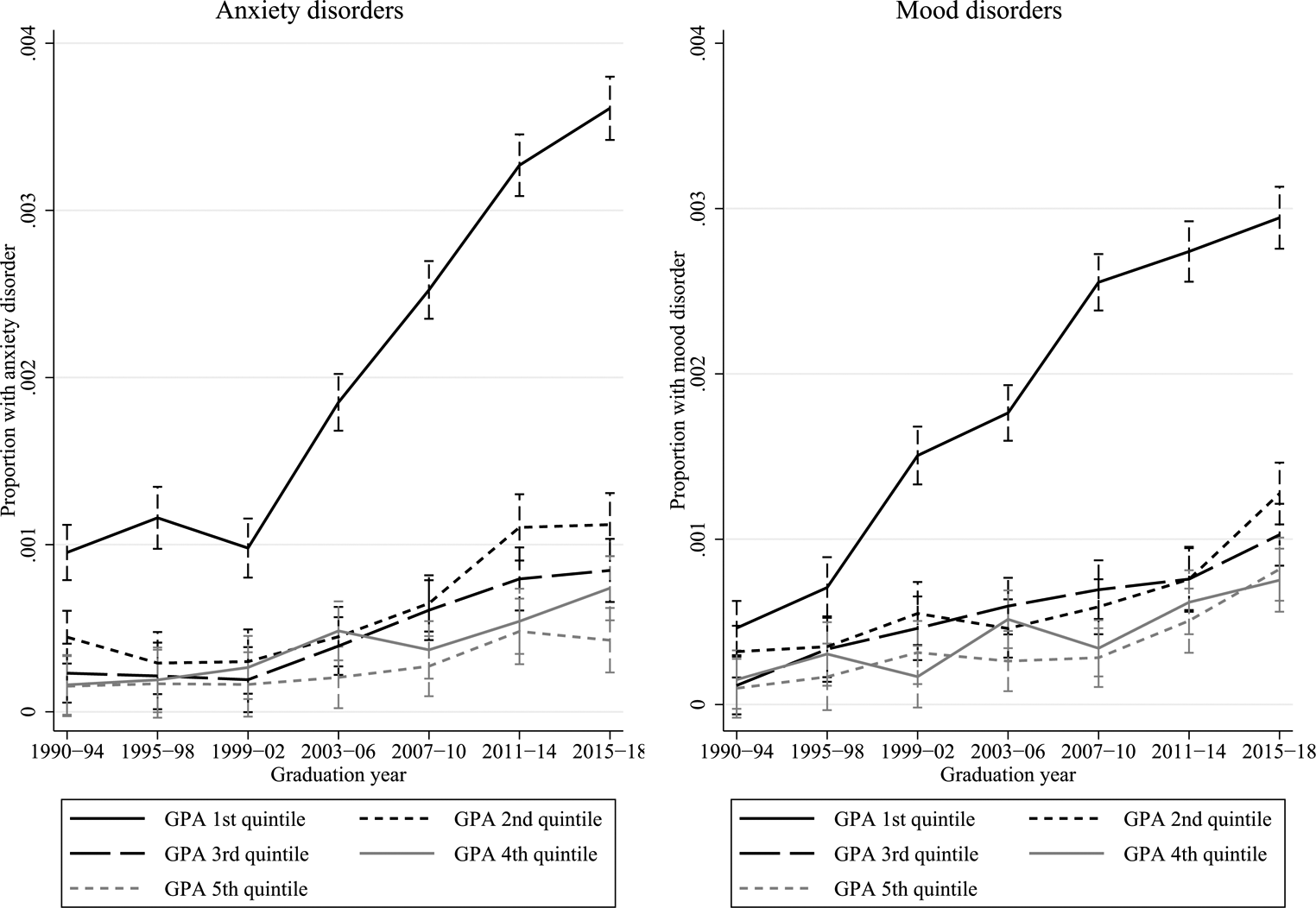 The focus of the analyses was on the absolute and relative changes over time in the proportion with anxiety or mood disorders depending on academic achievement. In analyses of GPA, specific attention was paid to comparisons of the 1st (lowest) and the 2nd -5th quintiles combined. The term relative risk was used to describe the ratio of the proportion with anxiety or mood disorders in the 1st (lowest) compared to the 2nd -5th quintiles, or the ratio of the proportion with anxiety or mood disorders among ineligible students compared to eligible students. A significance level of 0.05 was applied. The analyses were conducted using Stata v 14.