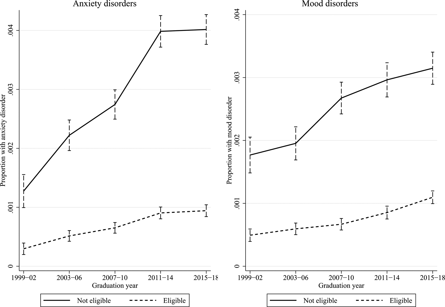 Research question 2: Has the relationship between upper secondary school eligibility and anxiety or mood disorders changed between 1990 and 2018?