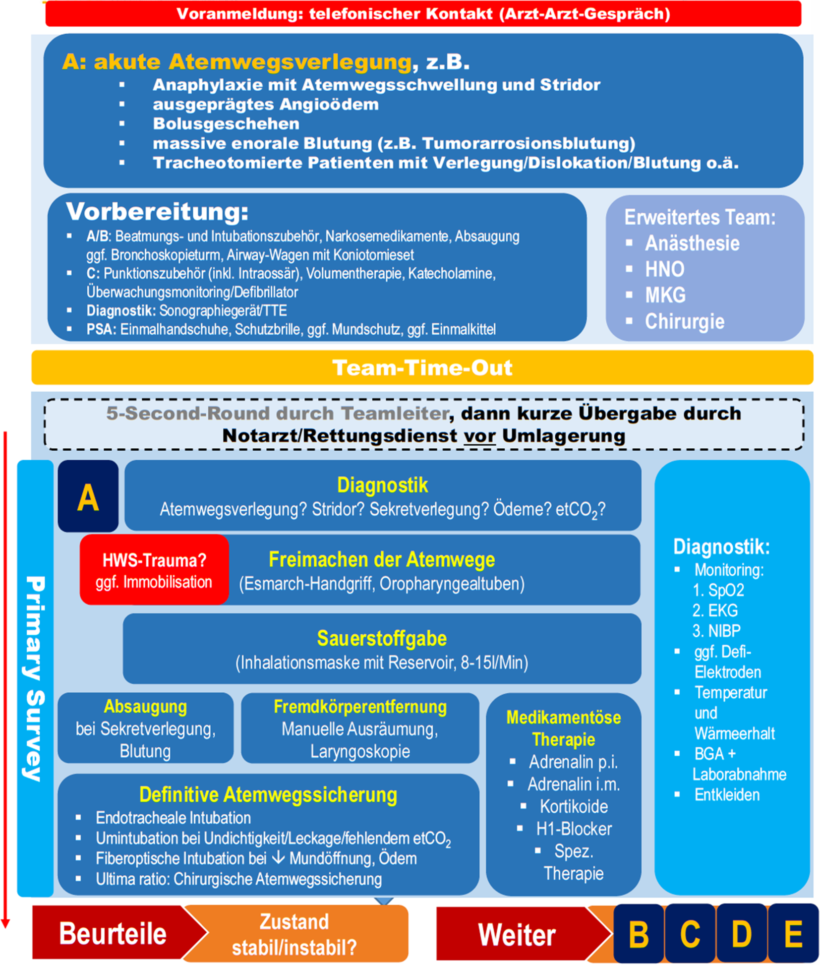 Entsprechend der Notfallsituation, Ersteinschätzung durch den professionellen Rettungsdienst und die Verdachtsdiagnose ist insbesondere bei „A-Problemen“ bzw. akuten Atemwegspathologien ein unverzügliches Handeln überlebenswichtig. So sollte z. B. im Bedarfsfall ein Bronchoskop zur fiberoptischen Inspektion und Intubation bereits vor Eintreffen des Patienten bereitgestellt sowie ggf. anästhesiologische Expertise zur Unterstützung angefordert werden. Auch das unmittelbare Hinzuziehen von Kollegen der Hals-Nasen-Ohren-Heilkunde (z. B. für eine flexible Endoskopie, Notfallkoniotomie/Notfalltracheotomie) sollte je nach Anmeldebild frühzeitig erfolgen, sofern diese Abteilungen in der Klinik vorgehalten werden. Die notwendigen Techniken sollten zukünftig auch für diese Notfallsituationen von einem klinischen Notfallmediziner in der zentralen Notaufnahme beherrscht werden.