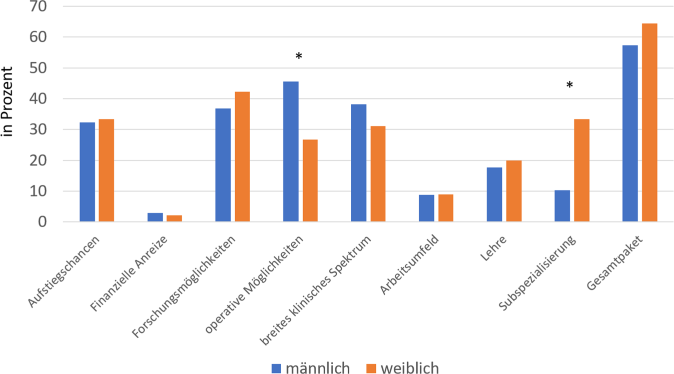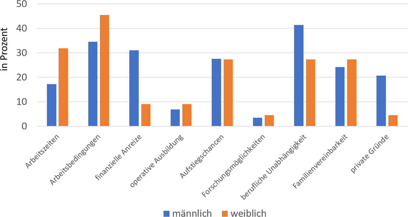 Für den Verbleib an der Universität nennen Männer das operative und breite klinische Spektrum als Gründe, Frauen hingegen v. a. Subspezialisierung und Forschungsmöglichkeiten. Männer verlassen die Universität eher wegen finanzieller Gründe, beruflicher Unabhängigkeit und privater Gründe. Frauen nennen hingegen häufig Arbeitszeiten, Arbeitsbedingungen und die Vereinbarkeit von Beruf und Familie. Auch hieraus geht ganz klar hervor, dass die Care-Arbeit bei den Frauen liegt und die Vereinbarkeit des Berufs mit Familie Gründe sein können, die Universität zu verlassen. Dies spielt bei Männern kaum eine Rolle.