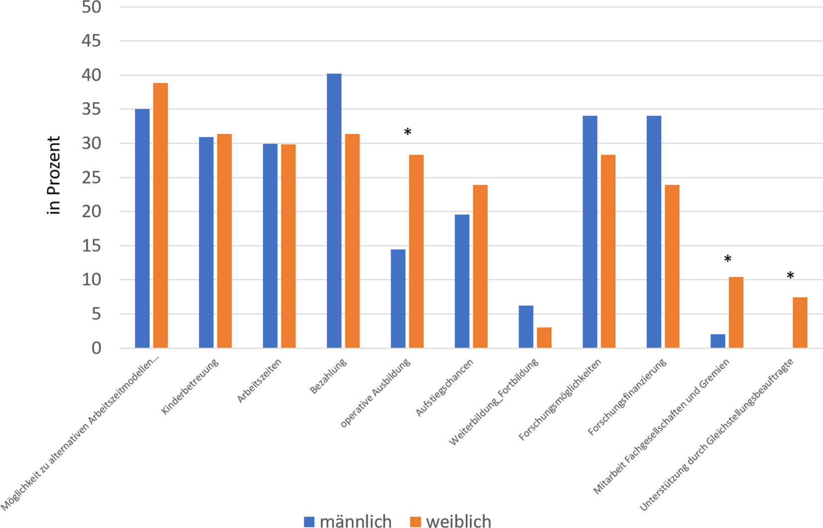 In der Auswertung gaben Männer als häufigste Gründe die Bezahlung (♂: 40,2 %, ♀: 31,3 % [χ2 = 1,342, df = 1, p = 0,247]), alternative Arbeitszeitmodelle (♂: 35,1 %, ♀: 38,8 % [χ2 = 0,241, df = 1, p = 0,624]), Forschungsmöglichkeiten (♂: 34,0 %, ♀: 28,4 % [χ2 = 0,587, df = 1, p = 0,444]) und Forschungsfinanzierung (♂: 34,0 %, ♀: 23,9 % [χ2 = 1,945, df = 1, p = 0,163]) als optimierbare Faktoren an; Frauen alternative Arbeitszeitmodelle (♂: 35,1 %, ♀: 38,8 % [χ2 = 0,241, df = 1, p = 0,624]), Kinderbetreuung (♂: 30,9 %, ♀: 31,3 % [χ2 = 0,003, df = 1, p = 0,955]), Bezahlung (♂: 40,2 %, ♀: 31,3 % [χ2 = 1,342, df = 1, p = 0,247]) und Arbeitszeiten (♂: 29,9 %, ♀: 29,9 % [χ2 = 0,000, df = 1, p = 0,995]) (Abb. 11). Von den Männern prozentual häufiger als optimierbare Faktoren genannt wurden v. a. Bezahlung (♂: 40,2 %, ♀: 31,3 % [χ2 = 1,342, df = 1, p = 0,247]), Forschungsfinanzierung (♂: 34,0 %, ♀: 23,9 % [χ2 = 1,945, df = 1, p = 0,163]) und Forschungsmöglichkeiten (♂: 34,0 %, ♀: 28,4 % [χ2 = 0,587, df = 1, p = 0,444]). Von den Frauen prozentual häufiger genannt wurden die Faktoren operative Ausbildung (♂: 14,4 %, ♀: 28,4 % [χ2 = 4,781, df = 1, p=0,029]), Mitarbeit in Fachgesellschaft und Gremien (♂: 2,1 %, ♀: 10,4 % [χ2 = 5,373, df = 1, p=0,020]), Unterstützung durch die Gleichberechtigungsbeauftragte (♂: 0,0 %, ♀: 7,5 % [χ2 = 7,466, df = 1, p=0,006]) und Aufstiegschancen (♂: 19,6 %, ♀: 23,9 % [χ2 = 0,435, df = 1, p = 0,510]) (Abb. 11).