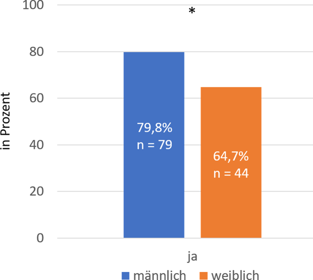 Kinder im eigenen Haushalt. Darstellung der Antworten auf die Frage „Leben oder lebten in Ihrem Haushalt Kinder?“ nach männlich (blau) und weiblich (orange) getrennt. x‑Achse: Antwort ja; y‑Achse: Anzahl der Antworten in Prozent. (χ2 = 4,732, df = 1, p=0,030), * p < 0,05